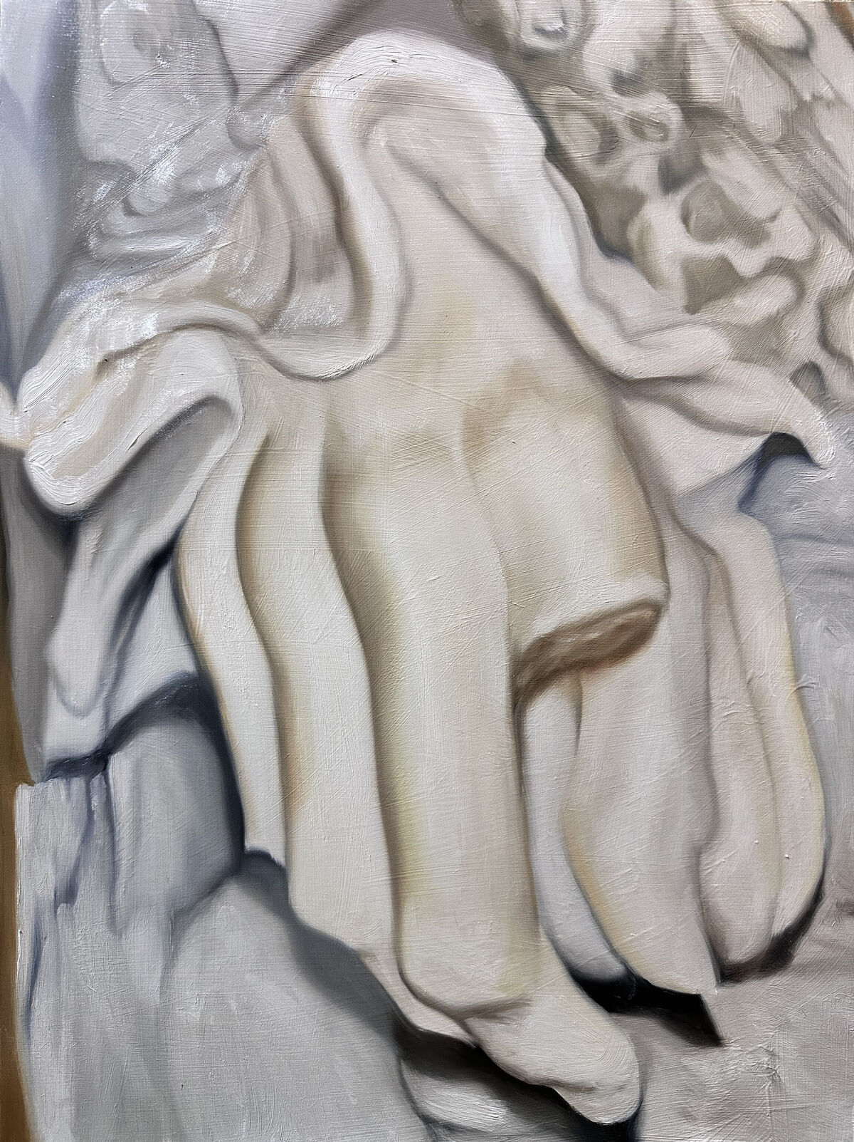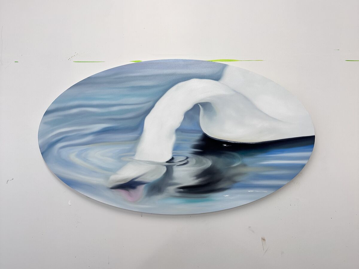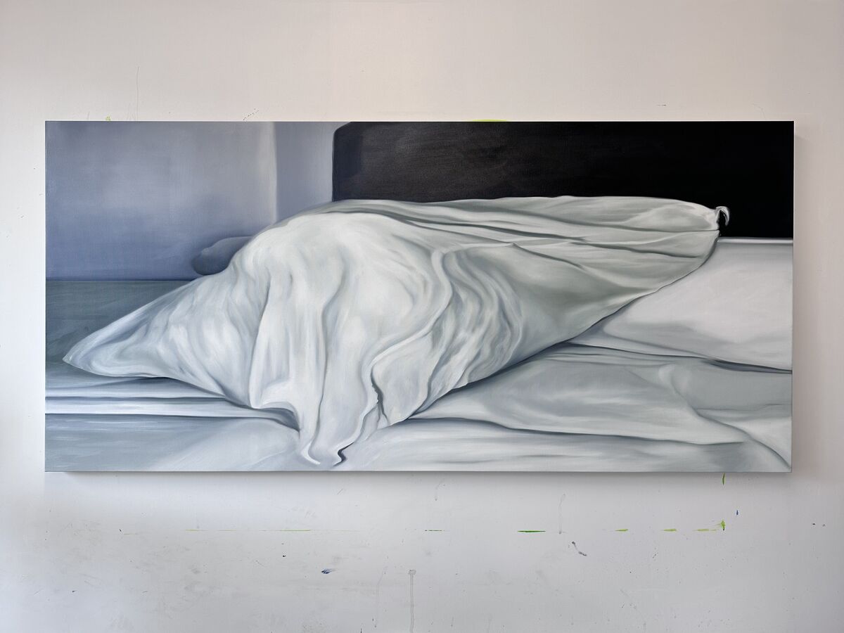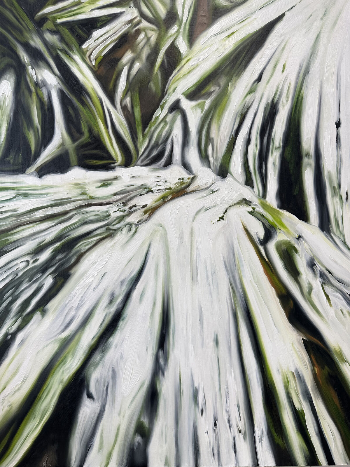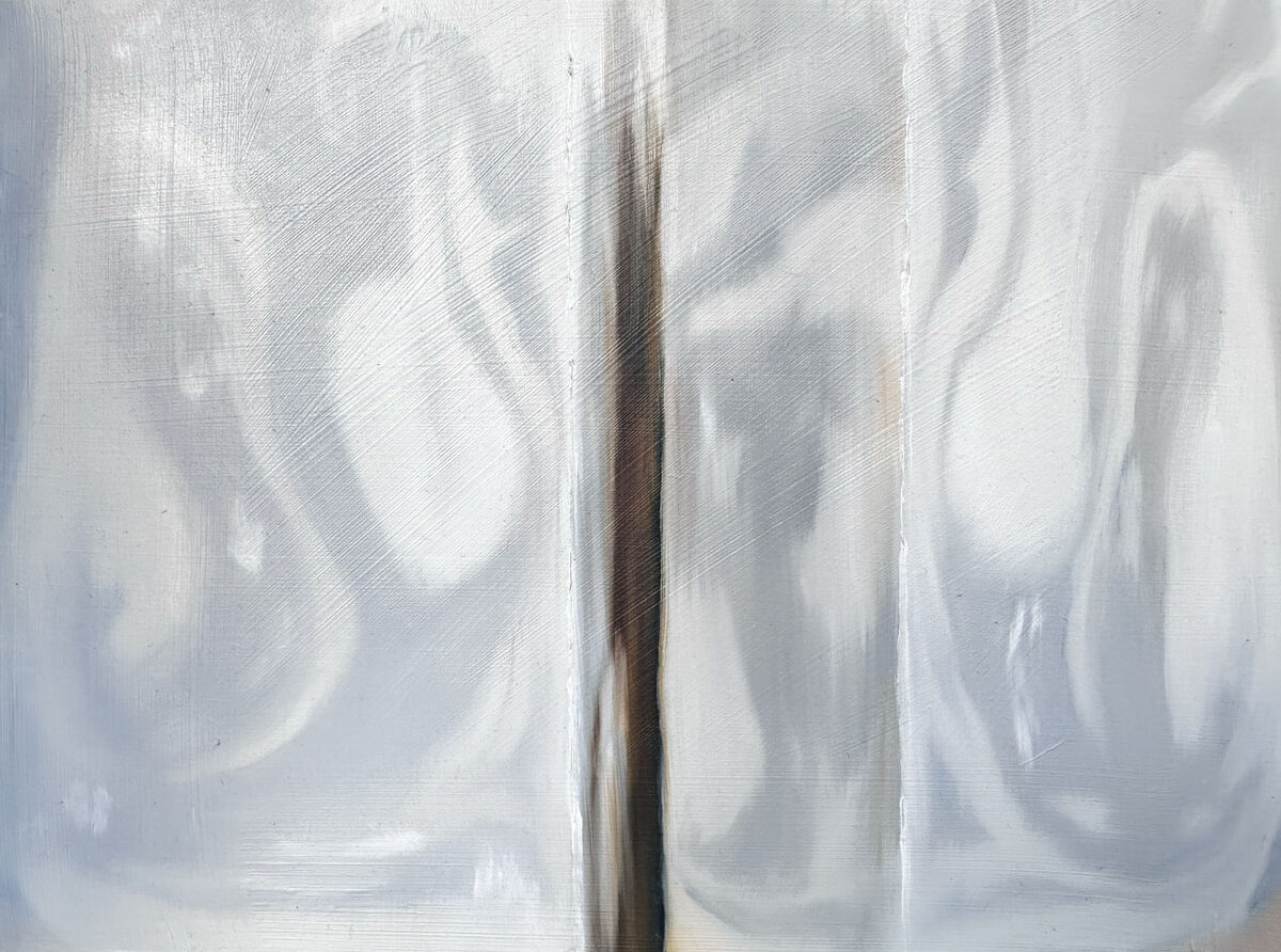 Camille Beauplan s’inscrit dans une approche critique de la techno-écologie et propose un regard dissident, non anthropocentré. La fuite des habitants, la fonte des glaciers et l’effondrement des repères ne sont plus nécessairement à empêcher, mais à penser autrement. Ceci se traduit plastiquement par une peinture sans hiérarchie ni point de vue imposé, oscillant entre abstraction et figuration. Comme des glissements de terrains, les formes s’affaissent, les surfaces se dérobent. Aucun sens de lecture, aucun arrière-plan, aucun centre. Chaque élément, même minime, est traité avec la même intensité, comme dans un paysage qui refuse toute domination.