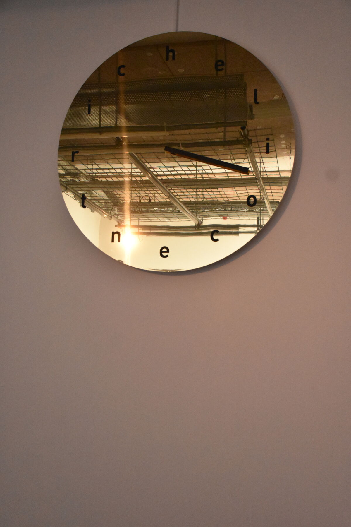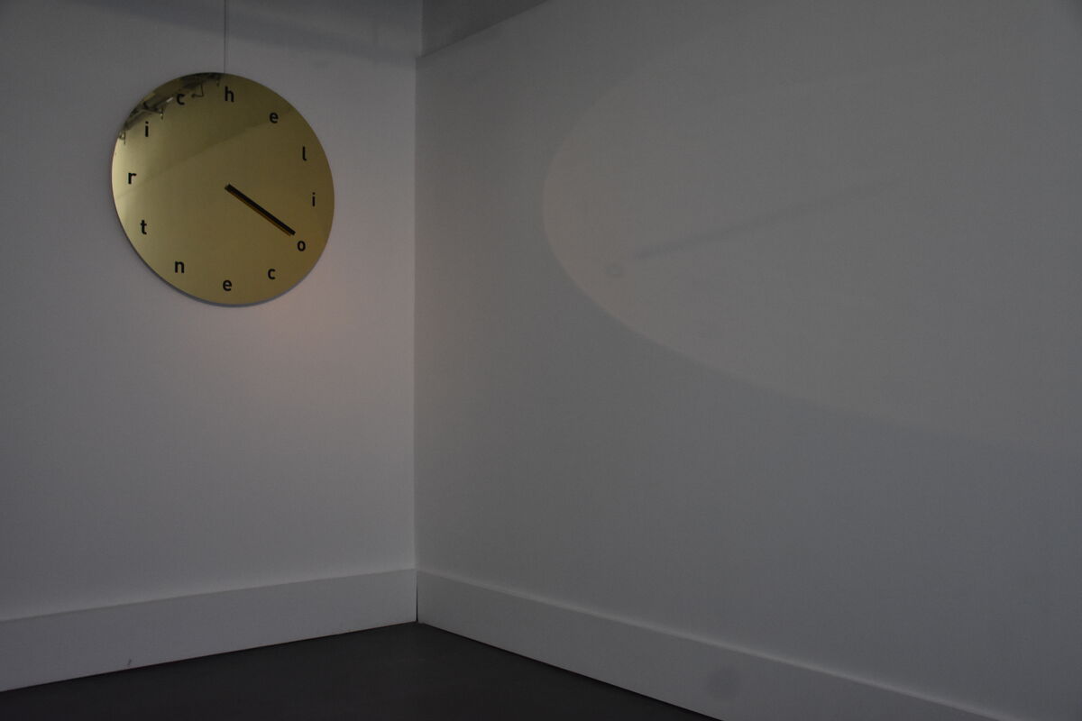 — Hellocentric'o'clock, 2026, dibond doré découpé au laser et gravé, moteur, 1,25 m de diamètre © BO