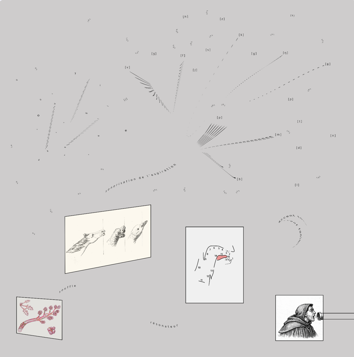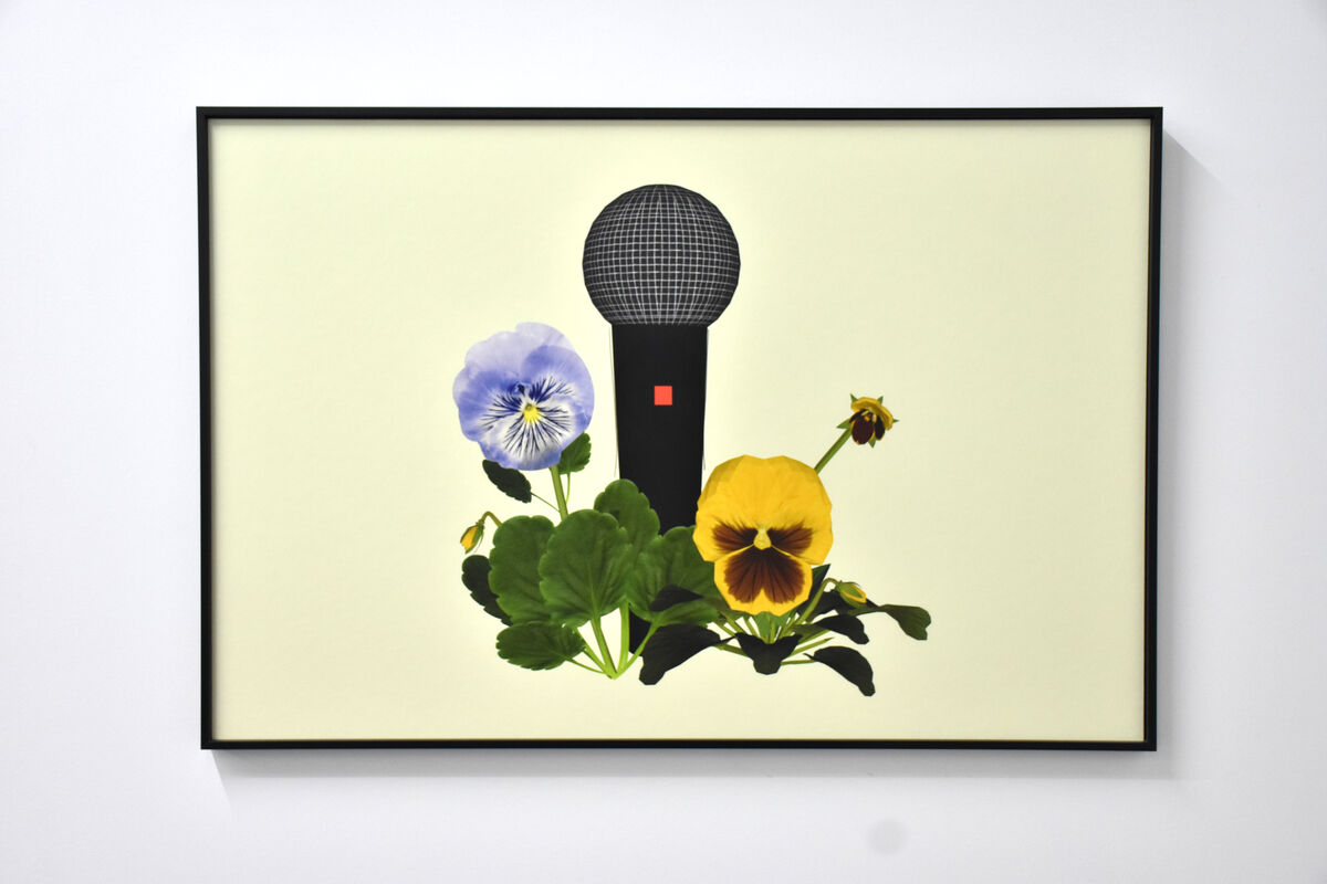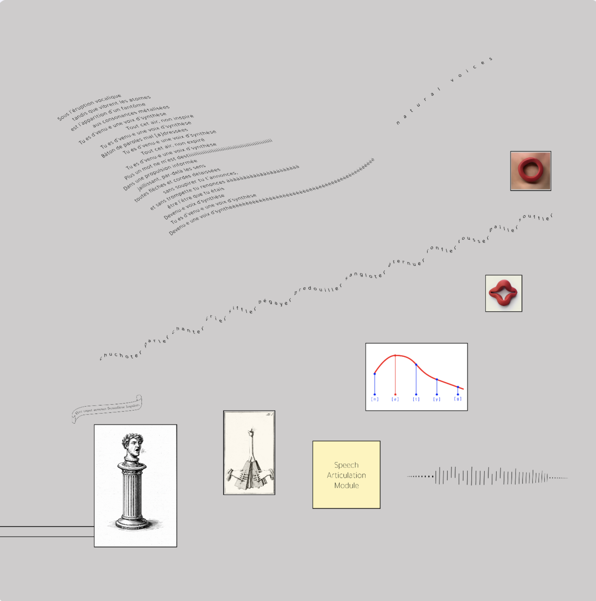 — Histoire naturelle des voix de synthèse, 2026, dessins numériques, collages, cadre alu, dimension : 70 x 70 cm par élément, triptyque © BO