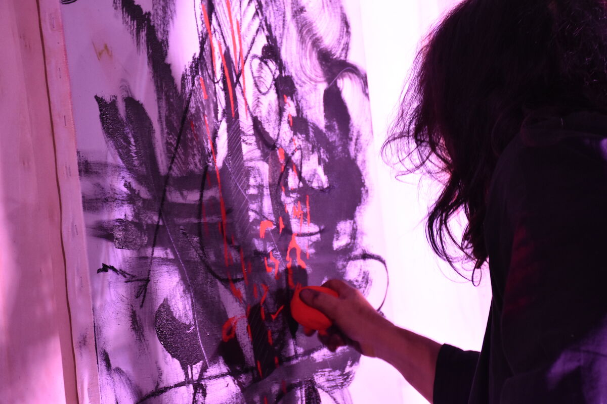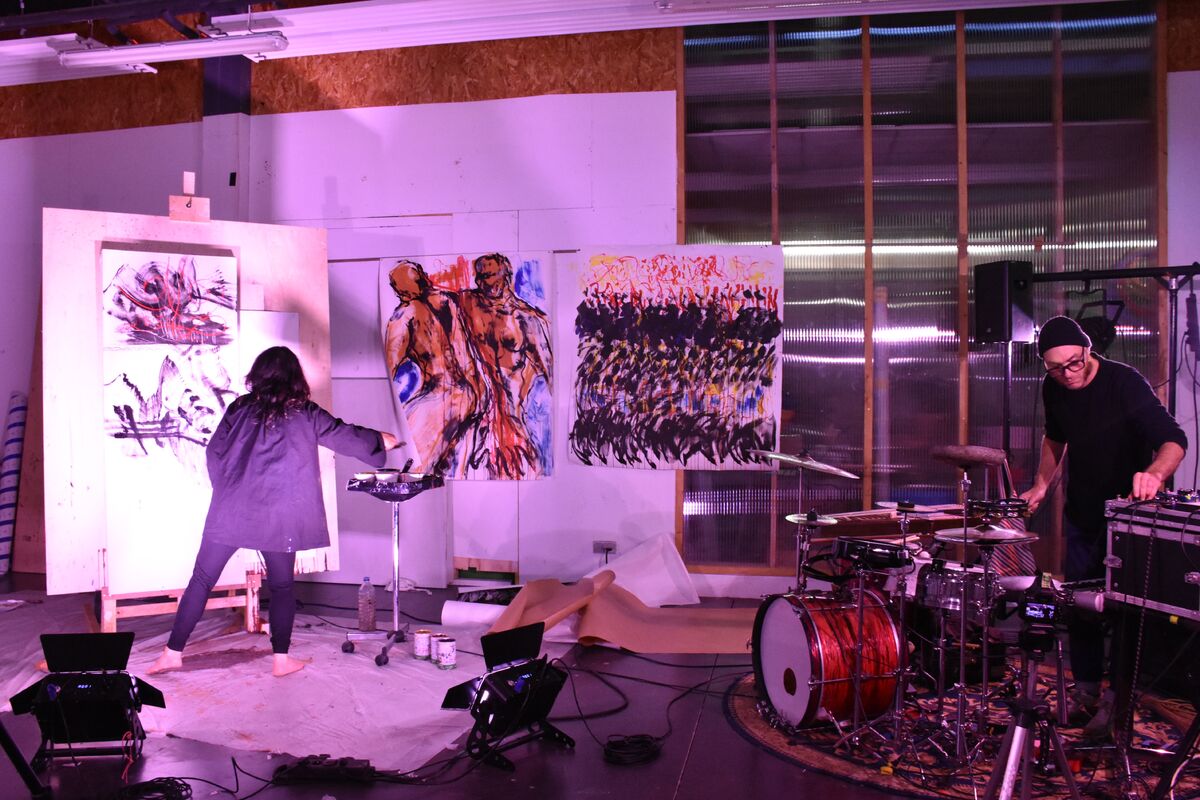 Vient le dernier axe Immersion . La lumière colorée de projecteurs sature l’espace de l’atelier ou du lieu de la performance. Cette immersion chromatique va influencer le musicien et entraîner un univers musical spécifique. Sur cette musique, la plasticienne fait un travail pictural de la même couleur que la lumière installée dans l’espace. Le musicien ne peut donc pas voir ce que son binôme réalise, il ne perçoit que sa gestuelle. Il peut ainsi se centrer sur son jeu de sons et sa propre perception intérieure. À la fin, la lumière blanche est rétablie. Le travail de la plasticienne se révèle.