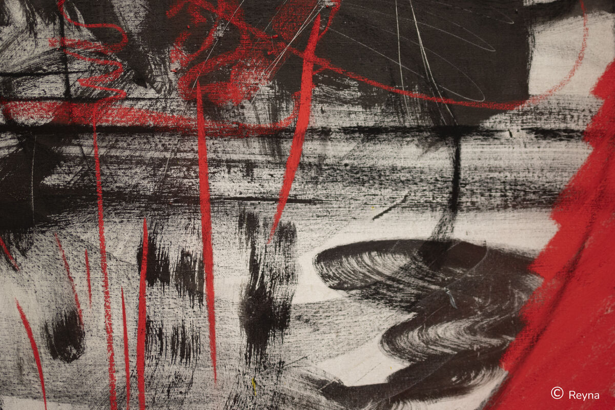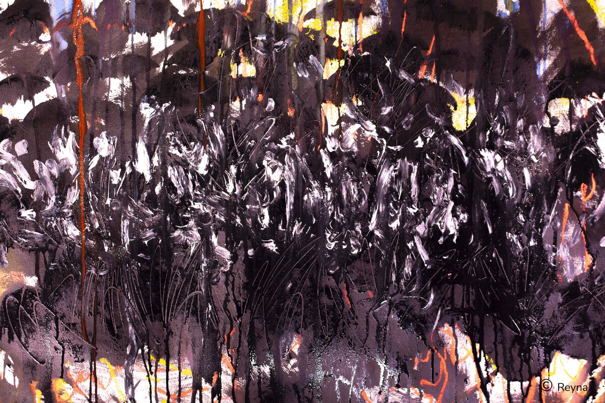 Avec ce vocabulaire simple apparaît une composition abstraite saturée et très structurée, appuyée par la variation des outils plastiques.