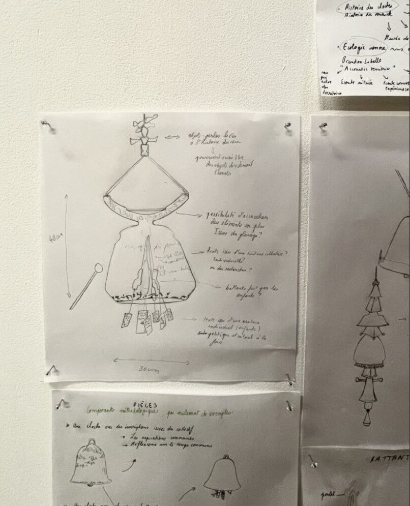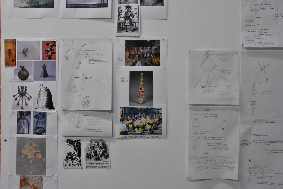 Au Bel Ordinaire, j’ai poursuivi ma recherche sur les cloches en menant plus précisément une enquête sensible sur les sonnailles. Je me suis notamment rendue dans les vallées du Haut-Béarn (Pyrénées au sud de Pau) afin de réaliser des enregistrements sonores de sonnailles et de clochers. À l’atelier, j’ai ensuite commencé à assembler ces enregistrements avec d’autres, issus de sonneries plus numériques mais s’inspirant de celles des cloches, pour composer le début d’un paysage sonore fictif, en tension avec les transformations contemporaines de nos communs sonores (individualisation de l’écoute, motorisation des sons, saturation numérique…).