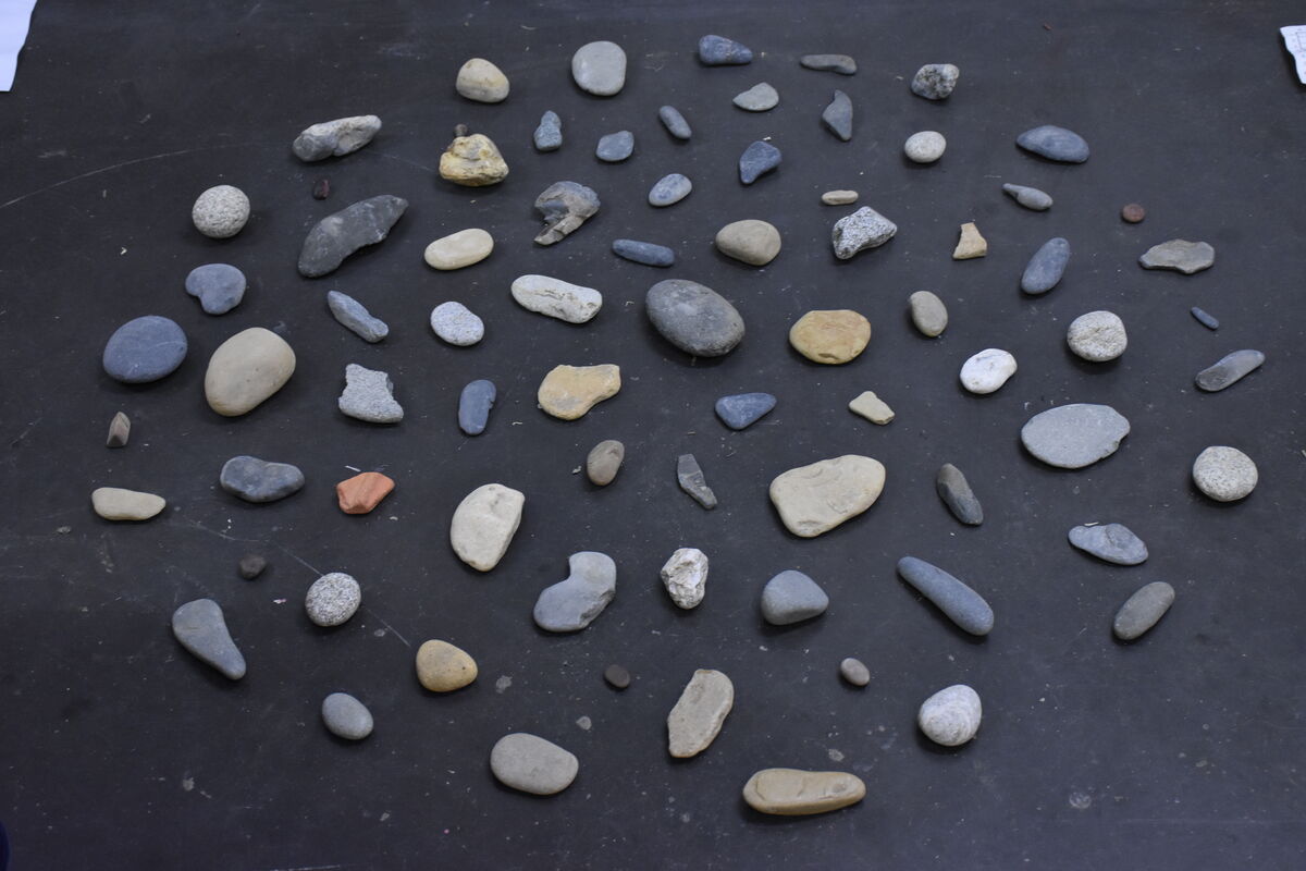 Sur la rive, je croise plusieurs foyers abandonnés. Ces cercles de pierres, vestiges d’une architecture minimale, témoignent d’une présence humaine passée, d’un temps révolu, propice à l’introspection comme à la parole. Certains de ces foyers sont rallumés et des pierres alentour placées sur les braises. Chaudes, elles sont ensuite déposées sur le papier. À l’opposé du temps long de l’érosion, le feu intervient comme une force brève et violente, révélant le travail continu du paysage. Les brûlures propres au relief de chaque pierre composent peu à peu un répertoire de signes, de caractères, une histoire des forces à l’œuvre.
