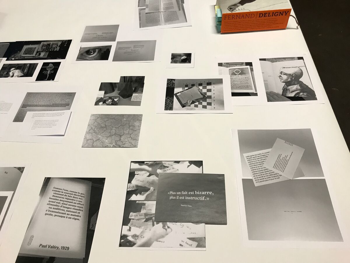 Le séjour au BO m’a permis également de faire des tests avec des lettres adhésives inscrites dans l’espace (mur, sol) où j’ai travaillé le ton sur ton (blanc sur blanc, noir sur noir) avec des phrases très courtes. C’est aussi une piste à poursuivre comme intervention in-situ. J’ai aussi profité des ressources documentaires du BO en faisant des recherches iconographiques et théoriques. Je me suis notamment appuyée sur les œuvres de Fernand Deligny pour la réalisation d’une des grandes cartes mentales, j’ai pu aussi trouver l’histoire des lettres transferts et arpenter une brève histoire des lignes de Tim Ingold qui parle de la ligne, à la fois dessin et écriture.