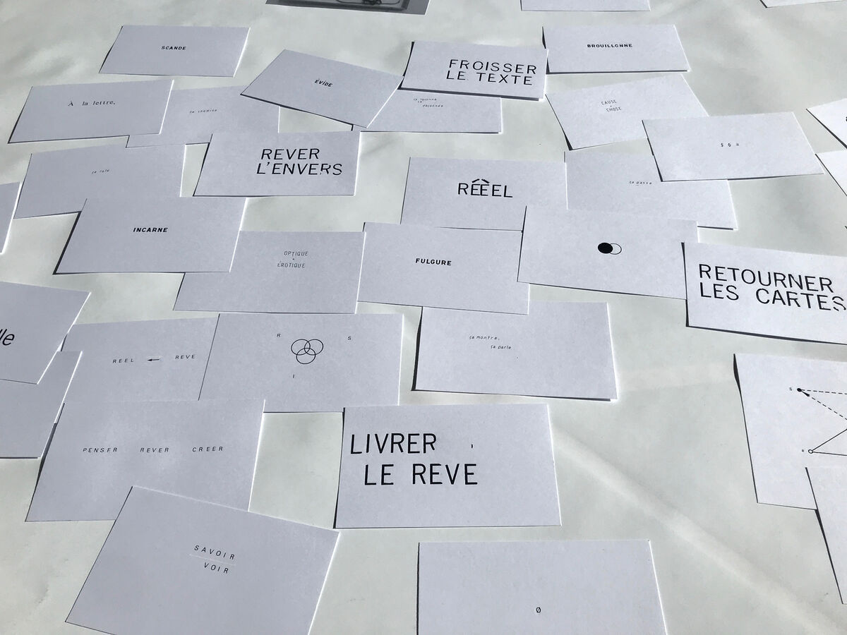 Un jeu d’une centaine de petites cartes bristol où sont inscrits des mots, des fragments, des associations de mots ou de verbes qui ont un lien avec le processus de création et/ou le processus du rêve. Les mots sont inscrits lettre à lettre par la technique artisanale et désuète de la lettre transfert. J’ai choisi de mettre en valeur l’aspect imparfait, les erreurs et les aléas inhérents à cette technique. Cette pièce, encore en devenir, n’a pas de forme fixe de présentation, le jeu de cartes permet d’imaginer de multiples combinaisons et possibles dispositifs de monstration. Ce jeu pourrait être activé sous la forme de performance qui engagerait une lecture aléatoire des cartes par tirage par exemple. C’est un champ encore à explorer. Et je ne pense pas avoir fini la réalisation des cartes.