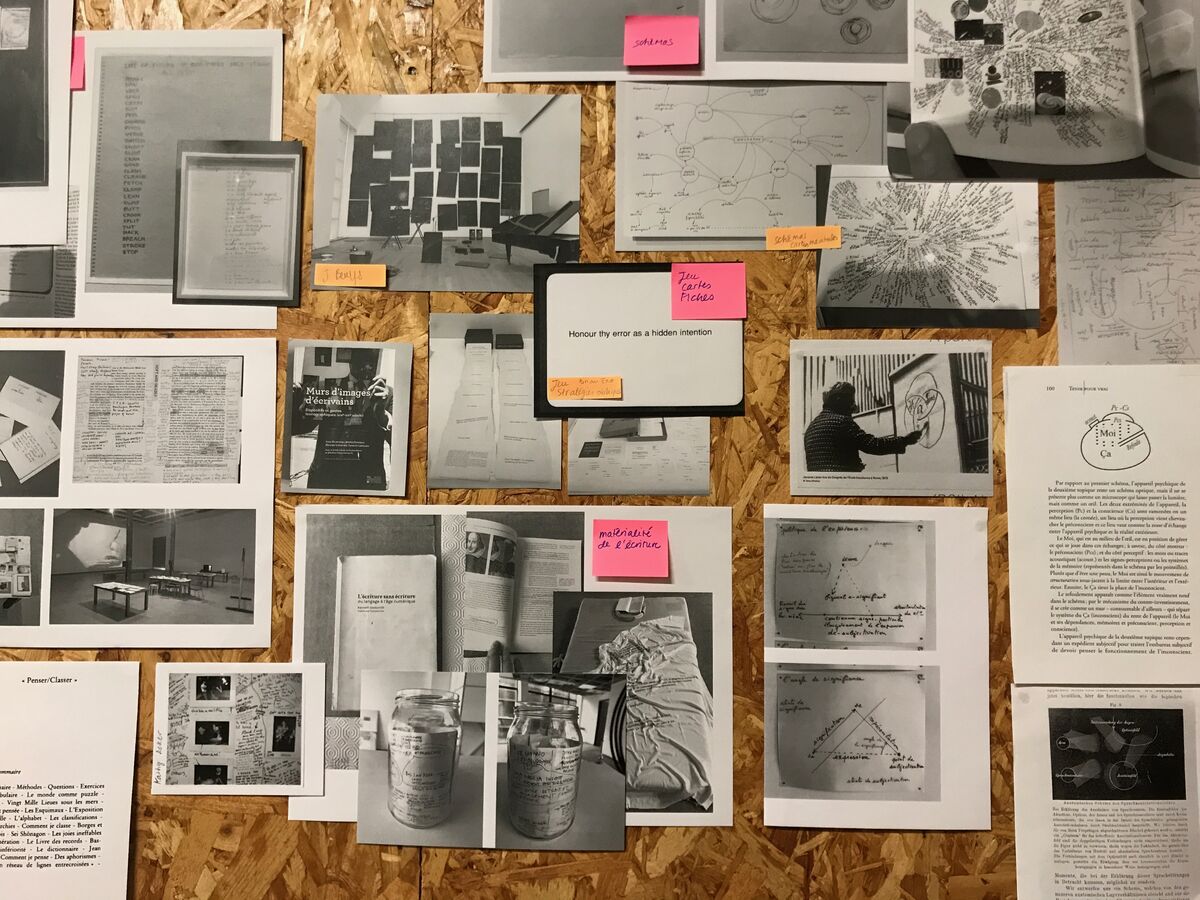 Lors de cette résidence, je souhaite développer mes pistes de travail autour de la mise en forme du processus de recherche lui-même. Comment donner à voir ce processus de création ? Comment faire se rencontrer images, textes, paroles, schémas, matériaux sonores, objets ? Comment articuler des éléments collectés aux matérialités variées ? Comment montrer les errances, les détours, les constructions précaires de ce qui cherche à se matérialiser ? Je poursuivrai cette collecte en explorant les ressources de la bibliothèque du Bel Ordinaire. À partir de cette collecte, je vais poursuivre la réalisation de cartes mentales, de schémas, de tables de travail, ainsi que la mise en espace d’un corpus iconographique.