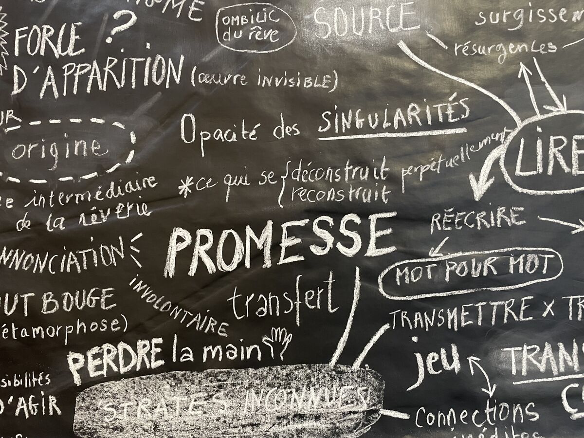 Les autres cartes produites sont des cartes mentales à grande échelle. Réalisées sur le dos de grandes affiches enduites d’une peinture noire imitant le tableau ardoise, je viens y écrire à la craie blanche. Lors de la résidence j’en ai réalisé trois. C’est une nouvelle forme que j’ai pu expérimenter au Bel Ordinaire du fait notamment de l’espace de l’atelier qui permettait de réaliser de grands formats. Je souhaite poursuivre cette piste de travail, j’ai pris beaucoup de plaisir à la réalisation de ces très grandes cartes. Cela m’a donné envie d’imaginer ce travail in-situ, de travailler à même les murs. Je me demande aussi comment ces cartes pourraient être l’outil, le support de performances qui activeraient les textes enchevêtrés contenus dans ces cartes. En effet leur forme peut prêter à de multiples jeux et sens de lectures.