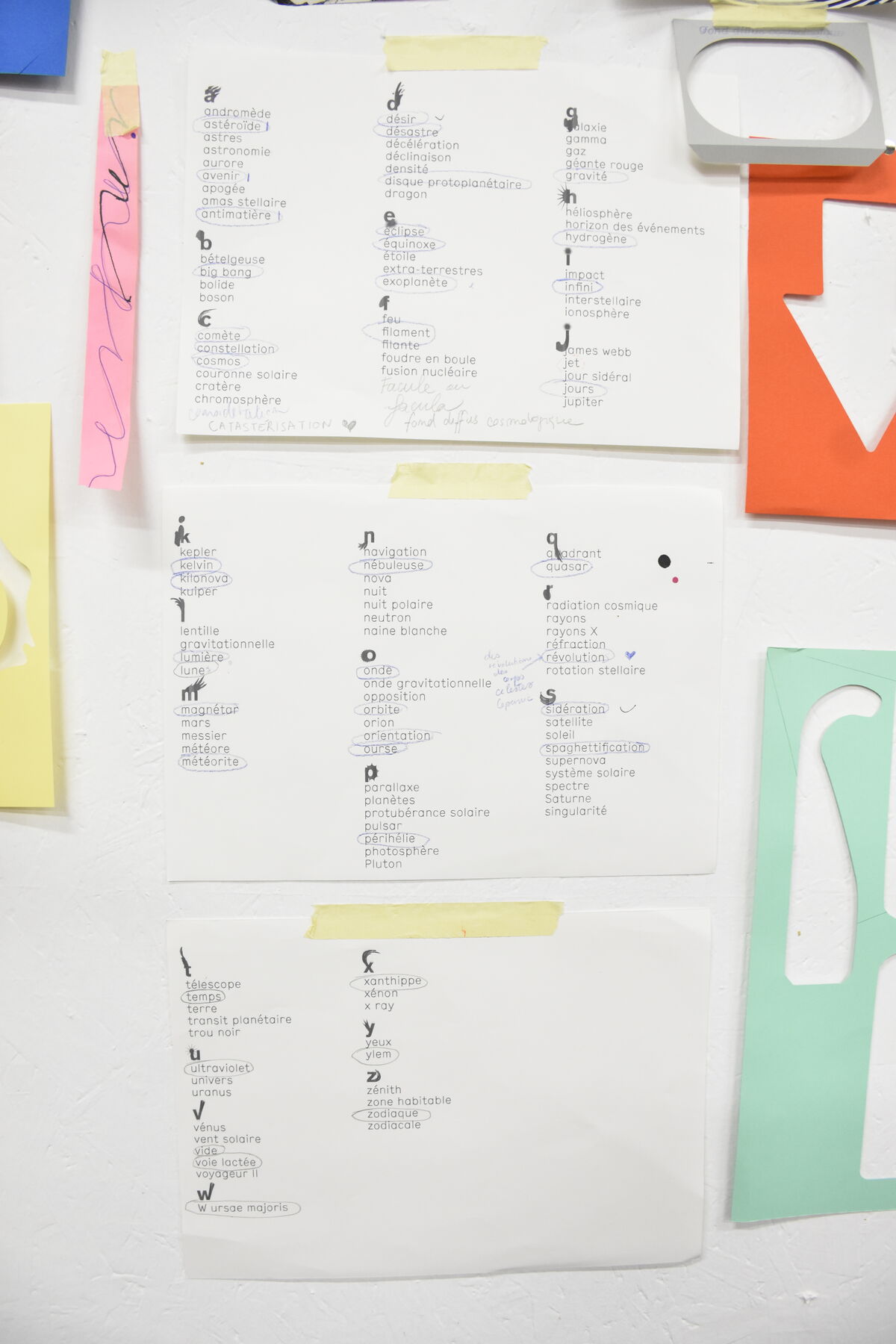 Pendant mon séjour au Bel Ordinaire, je compte amorcer un travail d’abécédaire – ou plutôt d’astro-bécédaire. Les mots comme des constellations de lettres sont une piste que j’ai envie de creuser. Je ne sais pas encore si cela prendra la forme d’un livre imprimé ou d’une collection d’objets graphiques à manipuler en direct. Ce sera en tout cas l’occasion d’explorer tout un vocabulaire parfois polysémique que nous offrent le ciel et les étoiles. Dans ces mots se juxtaposent des notions scientifiques à d’autres plus philosophiques ou mythologiques, ce qui sera aussi une piste pour explorer et faire se rencontrer différents univers.