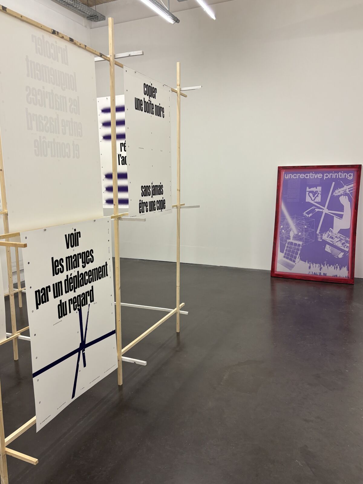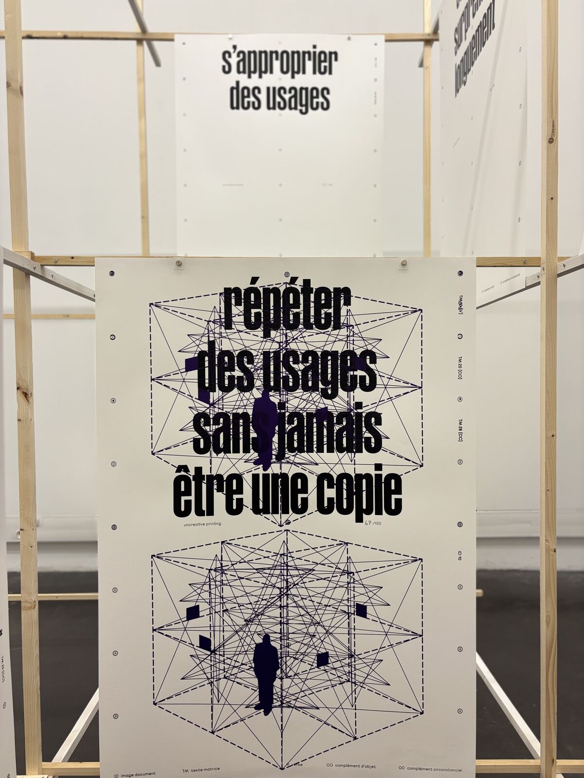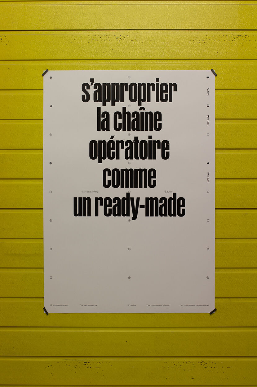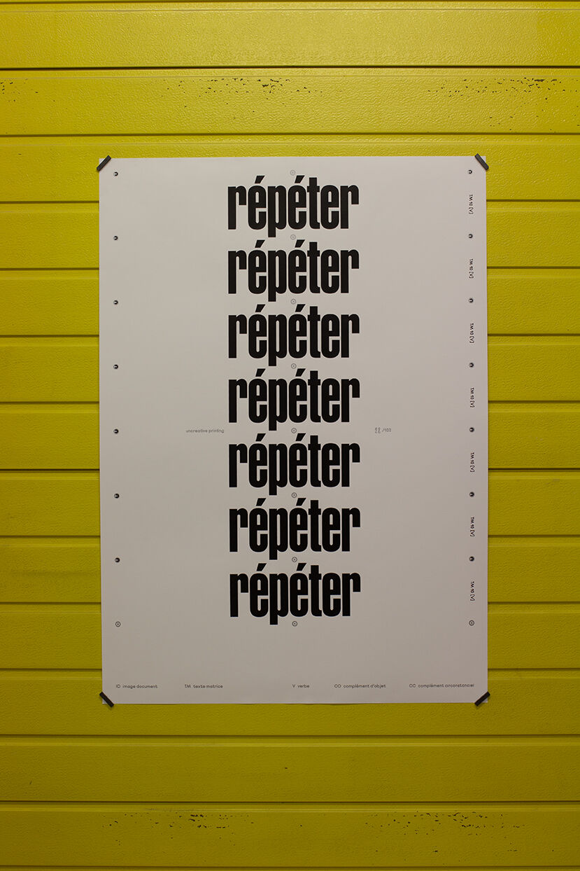 Uncreative Printing, leur résidence au Bel Ordinaire, leur permettra de procéder à l’activation imprimée de ce texte-jachère. Concrètement, leur travail consistera à éditorialiser les textes-matrices de (re)production et à les imprimer en sérigraphie sur un ensemble de 100 formats papier 70 × 100 cm. En suivant un principe combinatoire, ils chercheront à multiplier les compositions originales entre textes-matrices. Ce faisant, les différents tirages créeront autant de lectures et de relectures possibles qu’il y aura de combinaisons.