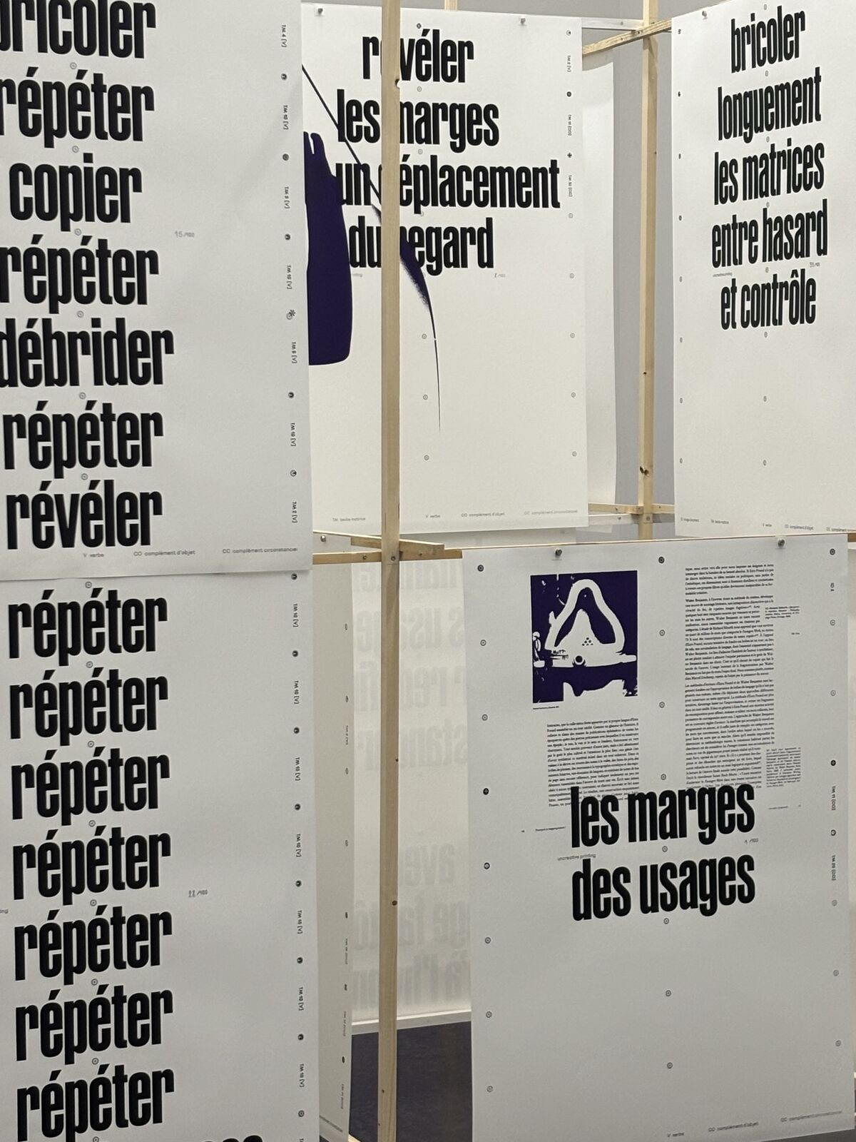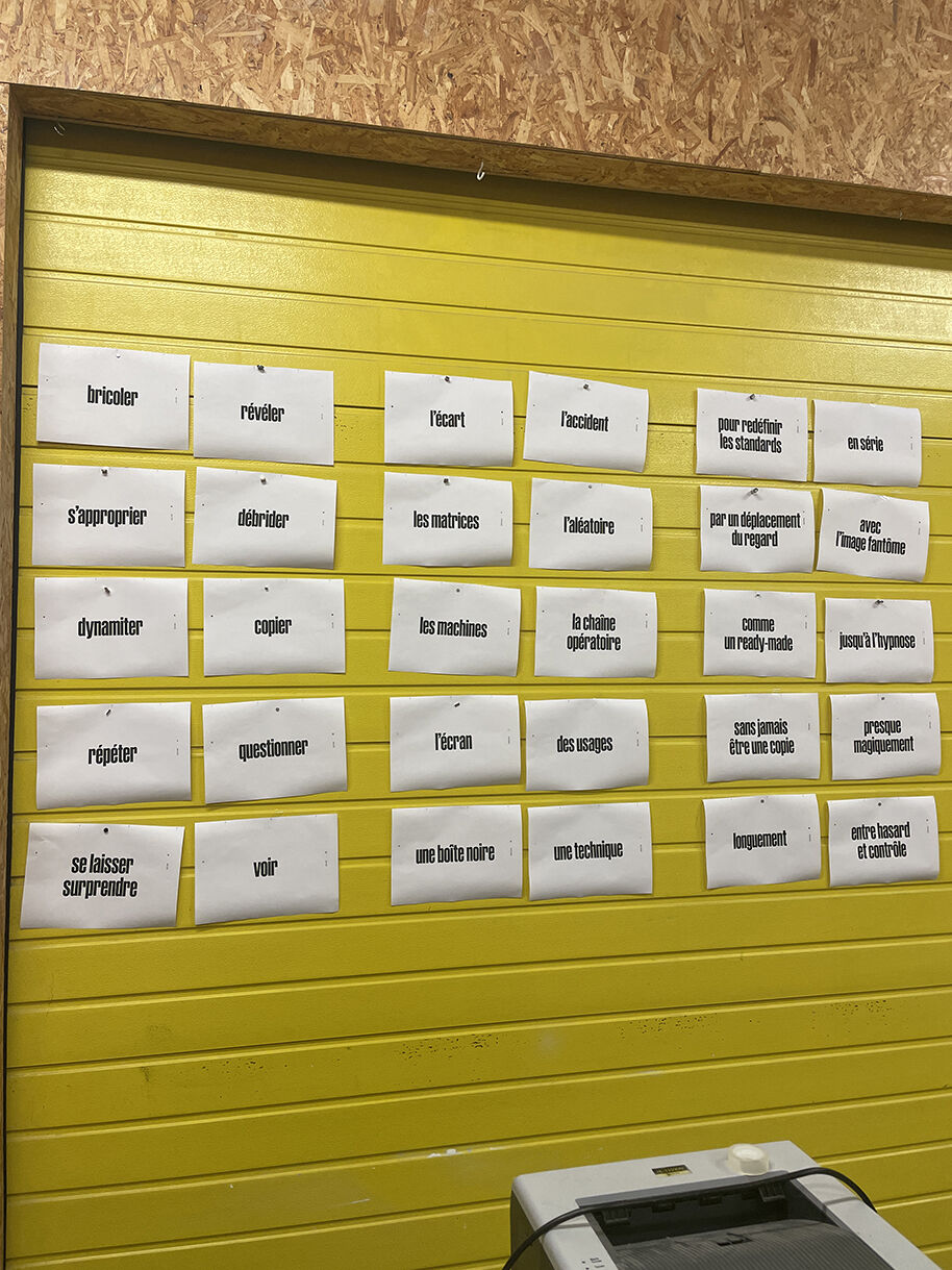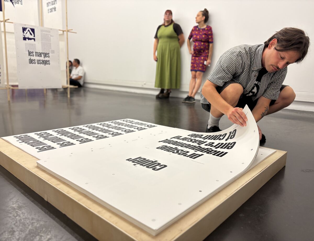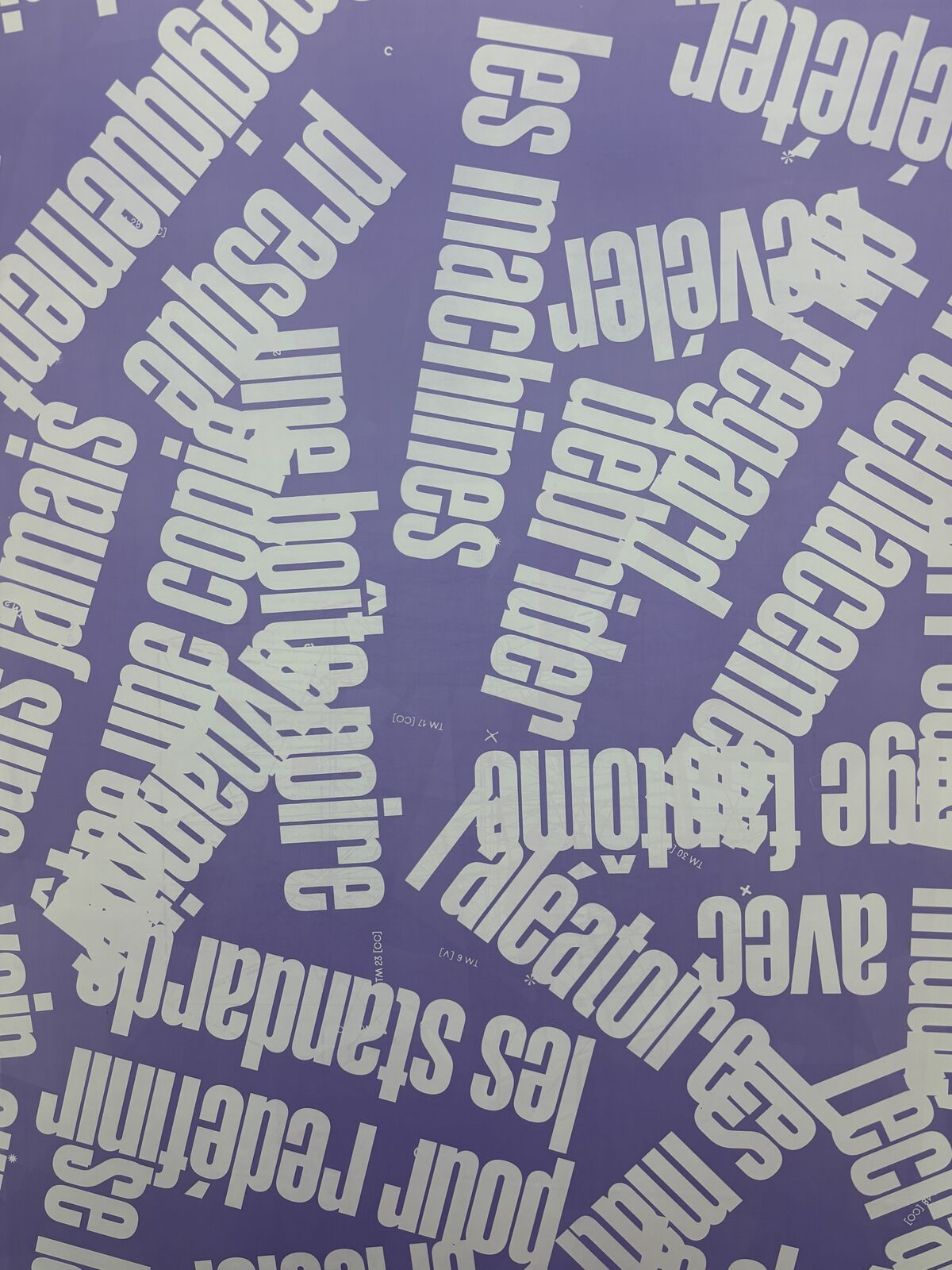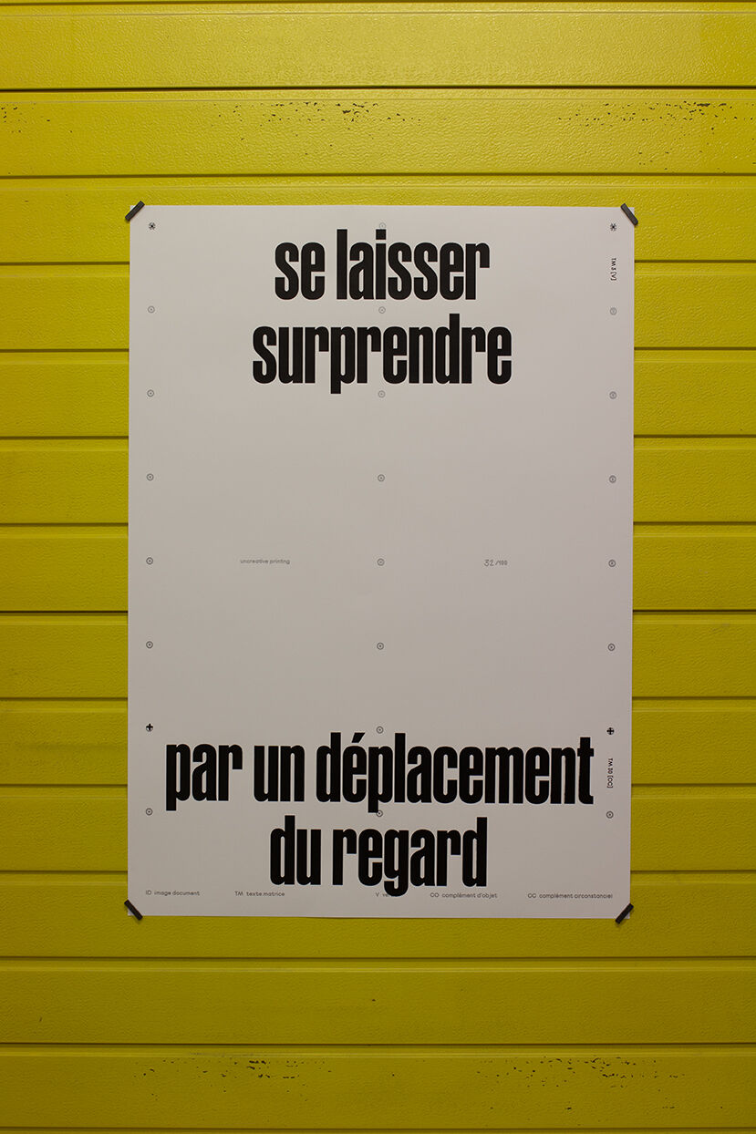 Uncreative Printing, leur résidence au Bel Ordinaire, leur permettra de procéder à l’activation imprimée de ce texte-jachère. Concrètement, leur travail consistera à éditorialiser les textes-matrices de (re)production et à les imprimer en sérigraphie sur un ensemble de 100 formats papier 70 × 100 cm. En suivant un principe combinatoire, ils chercheront à multiplier les compositions originales entre textes-matrices. Ce faisant, les différents tirages créeront autant de lectures et de relectures possibles qu’il y aura de combinaisons.