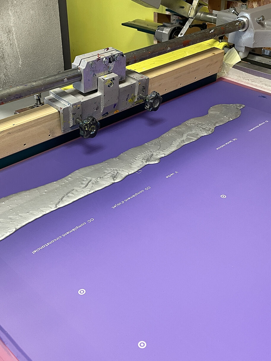 Léo et Romain souhaitent questionner les potentialités littéraires de l’imprimé en imaginant un texte qui ne se réalise pleinement qu’avec son impression, sa lecture et son existence se faisant au détour de son actualisation imprimée. En d’autres termes, placer l’impression comme élément constitutif du texte et non comme médium de reproduction. Leur question, simple en apparence, est la suivante : peut-on écrire avec un écran de sérigraphie ? Pour y répondre, ils projettent de transposer les mécaniques de la sérigraphie (émulsion, insolation, calage, superposition, jeu de couches, de transparence, etc.) aux étapes de rédaction d’un texte (sources, chapitrage, rédaction, relecture, etc.).