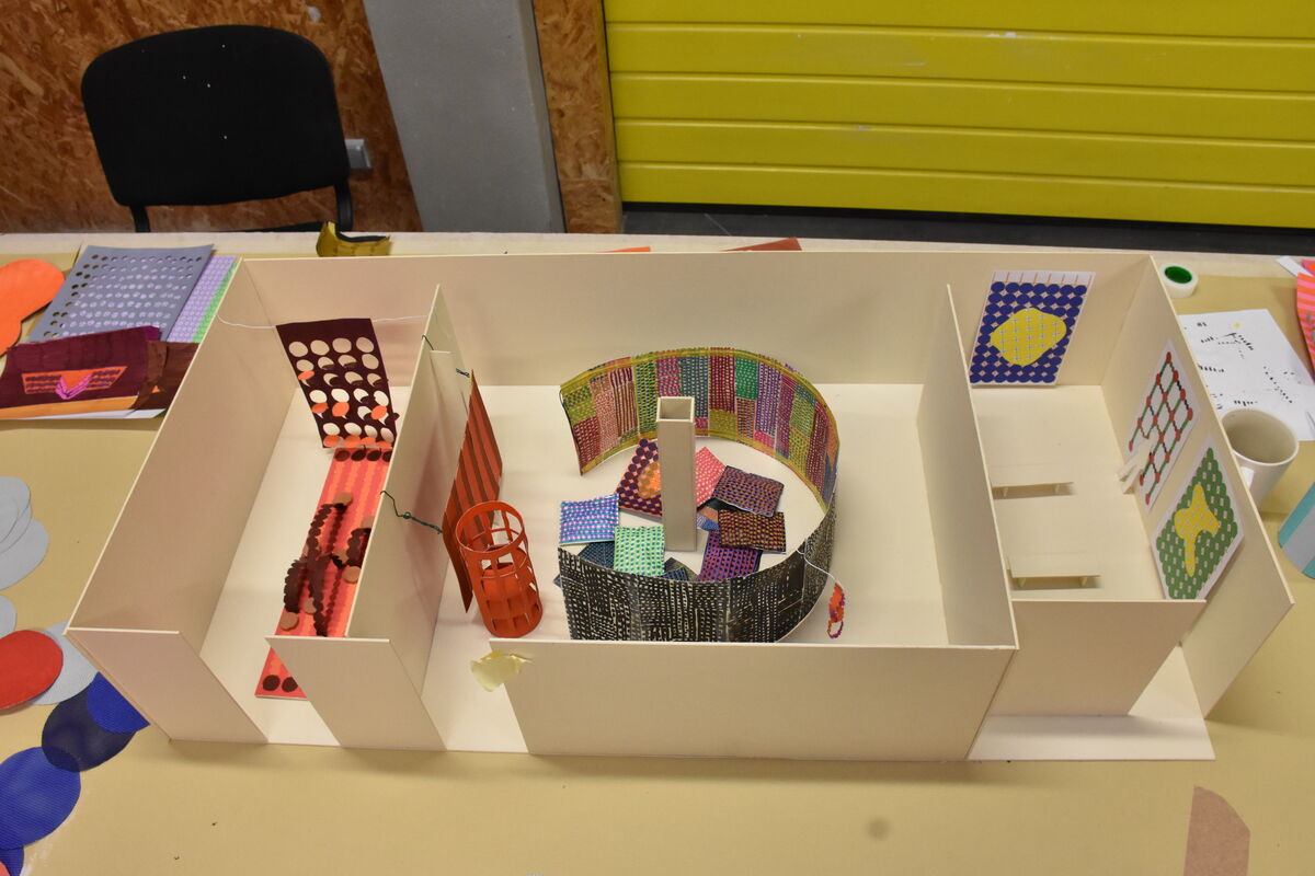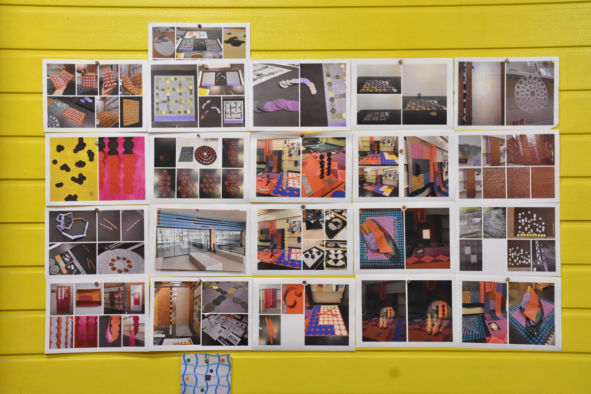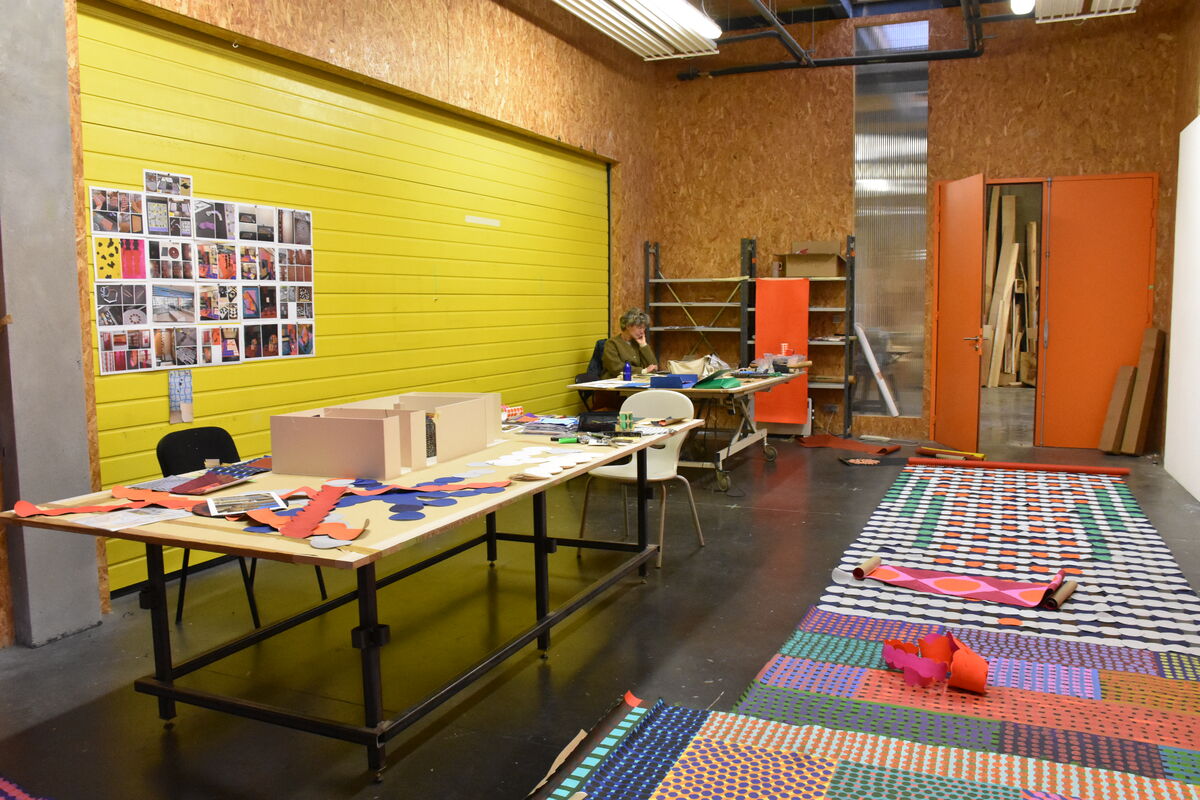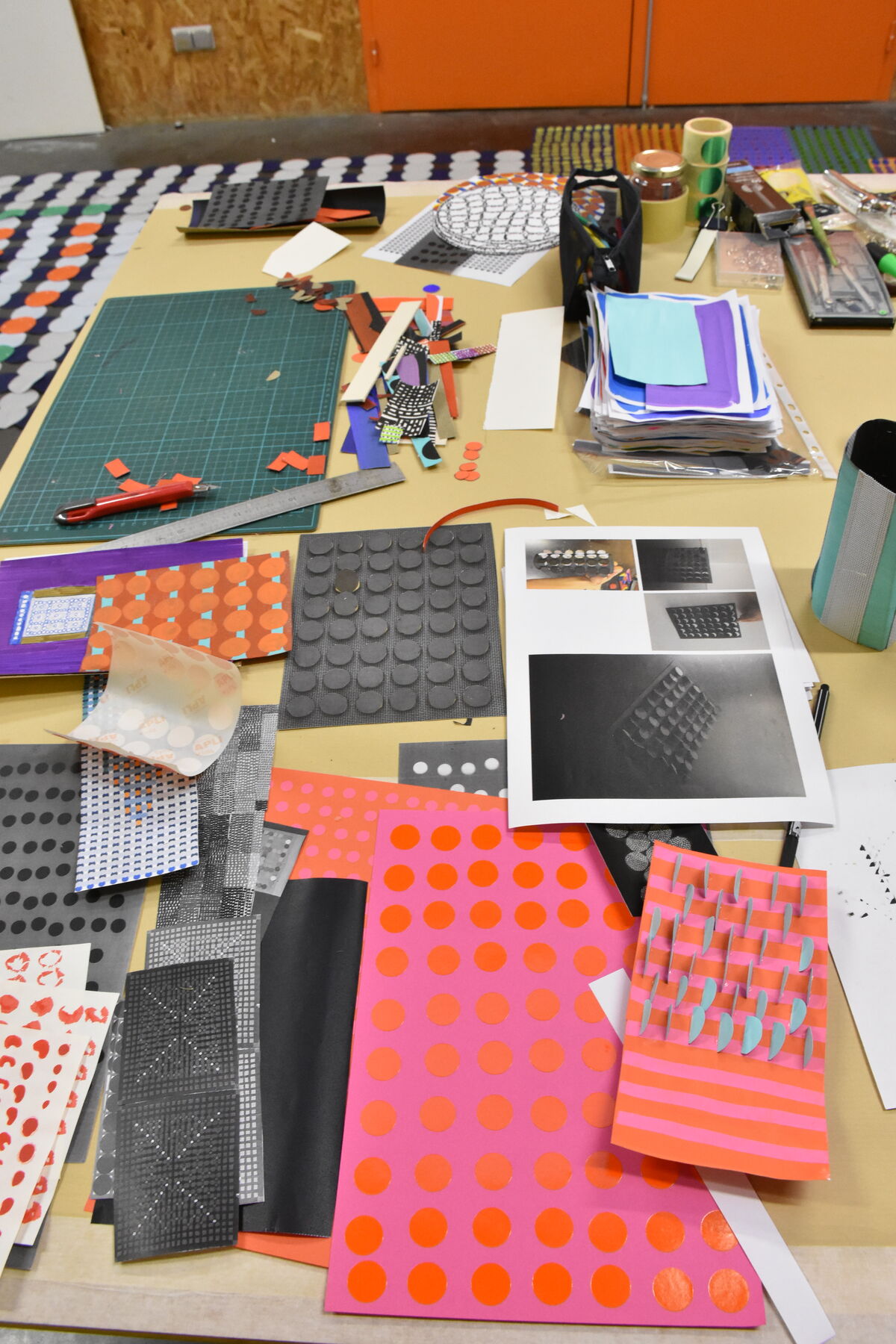 Je consacre également une partie de cette résidence à la conception d’une œuvre à jouer pour l’espace du P’tit BO. Je profite d’être sur place pour dessiner, valider les dimensions et proportions. Je réalise des échantillons et définis la règle du jeu et sa gamme de couleurs. Un dispositif d’initiation à l’espace, au plein et au vide, au motif et à la composition pour les grands et les petits !