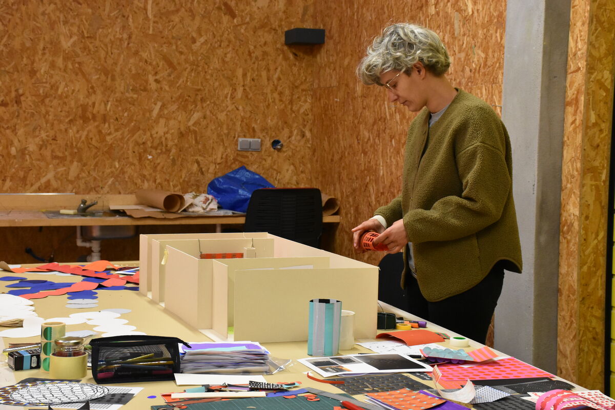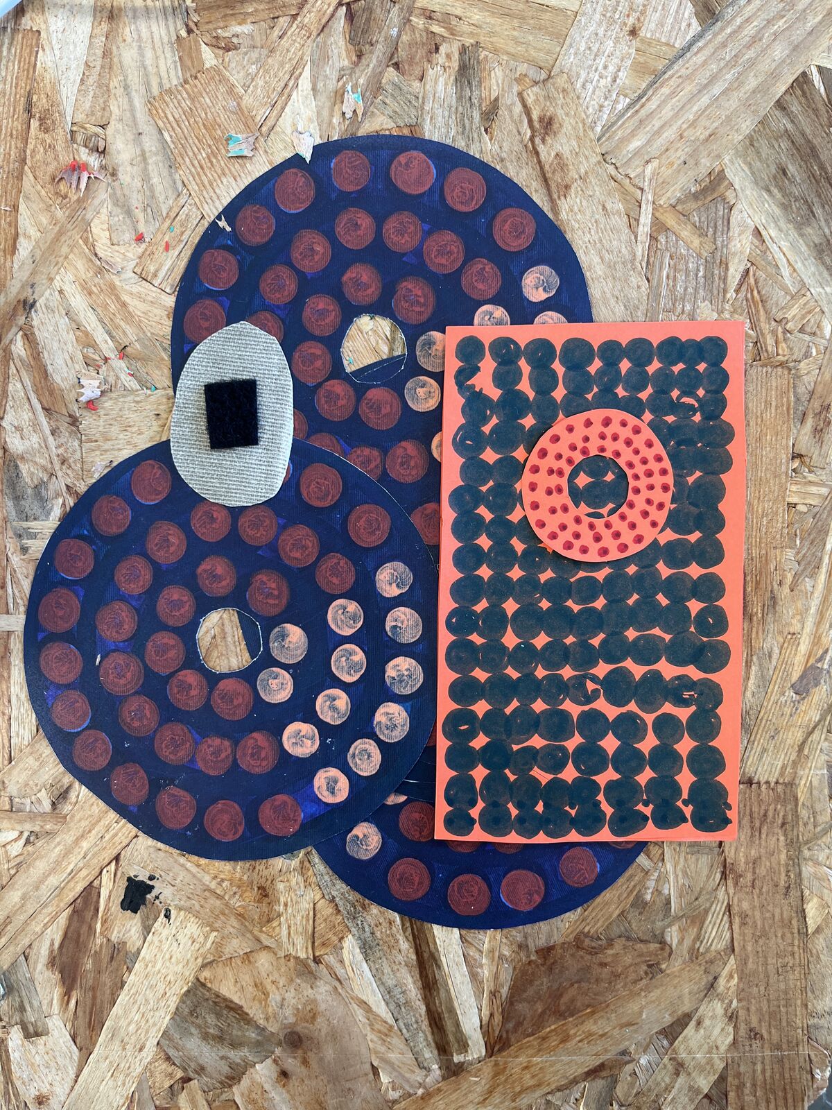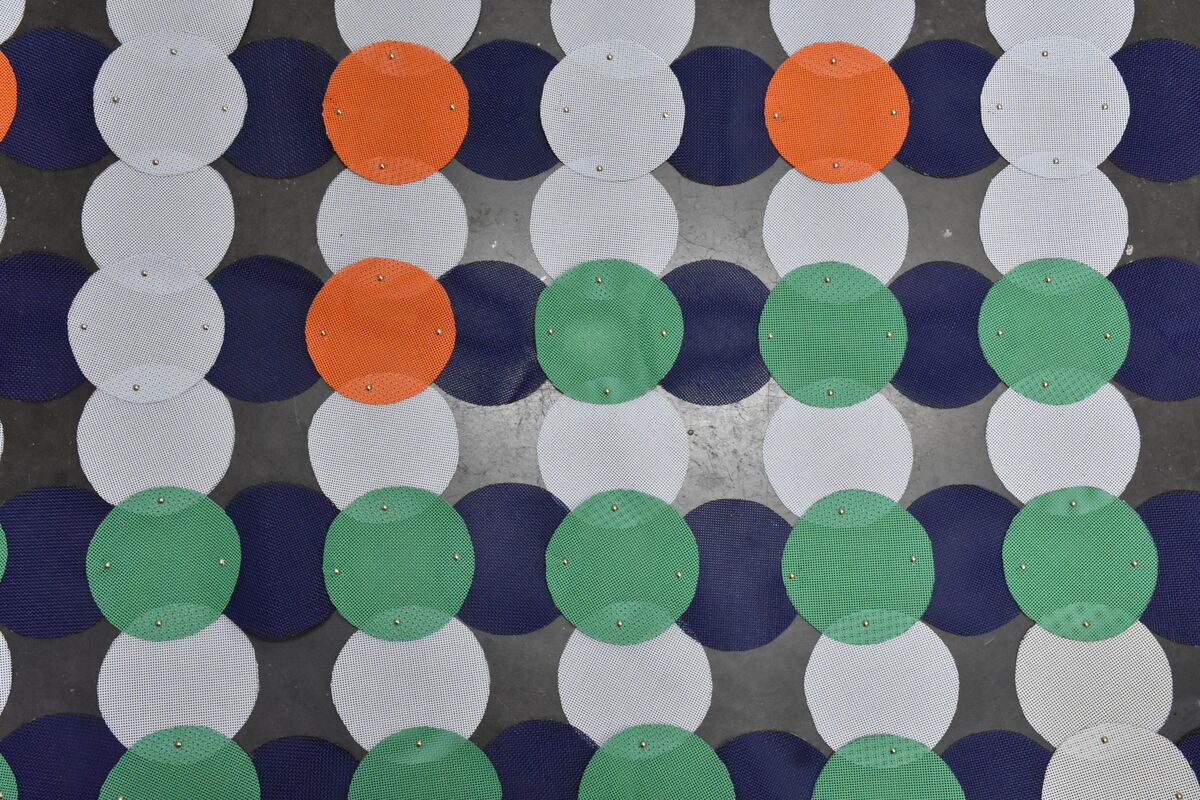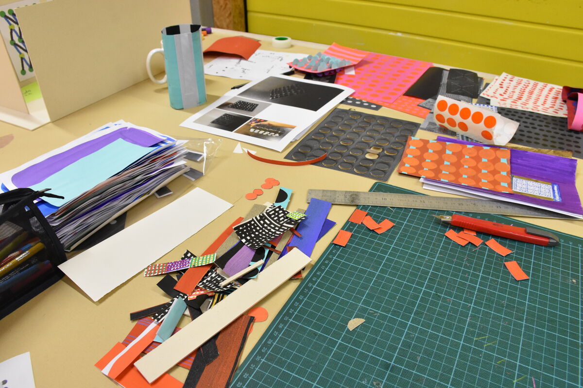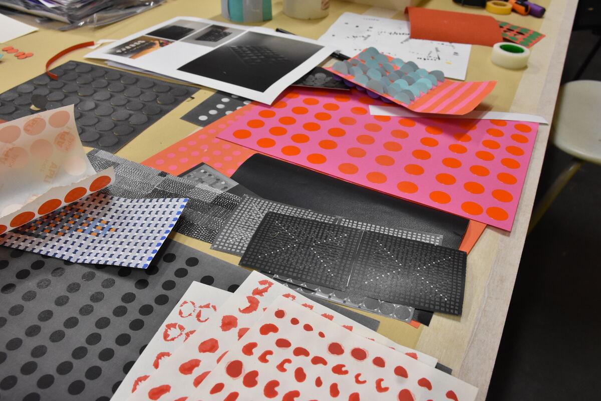 Je consacre également une partie de cette résidence à la conception d’une œuvre à jouer pour l’espace du P’tit BO. Je profite d’être sur place pour dessiner, valider les dimensions et proportions. Je réalise des échantillons et définis la règle du jeu et sa gamme de couleurs. Un dispositif d’initiation à l’espace, au plein et au vide, au motif et à la composition pour les grands et les petits !