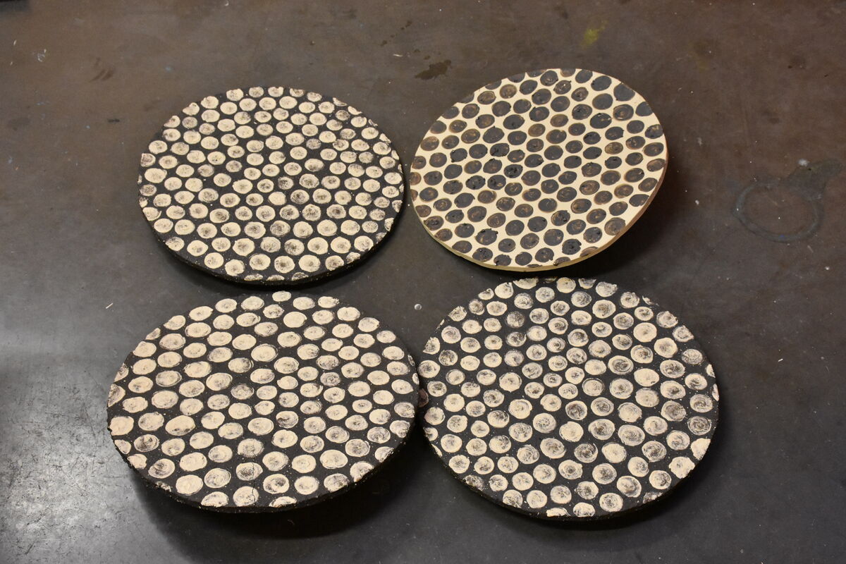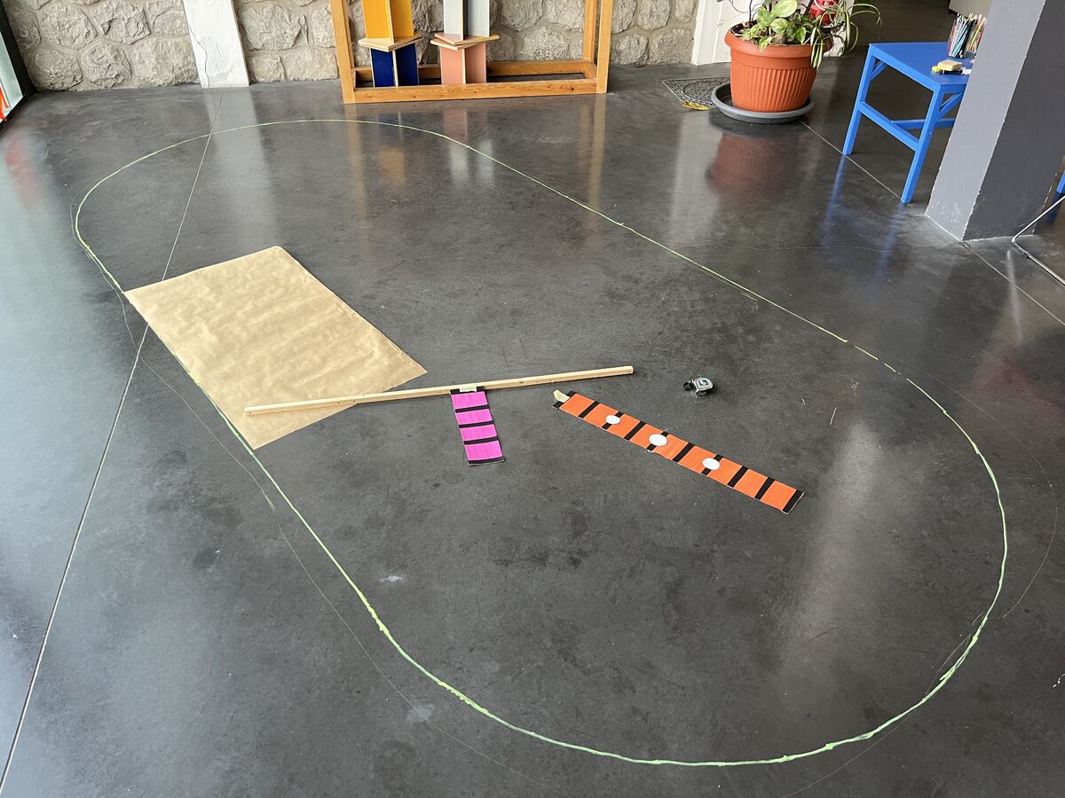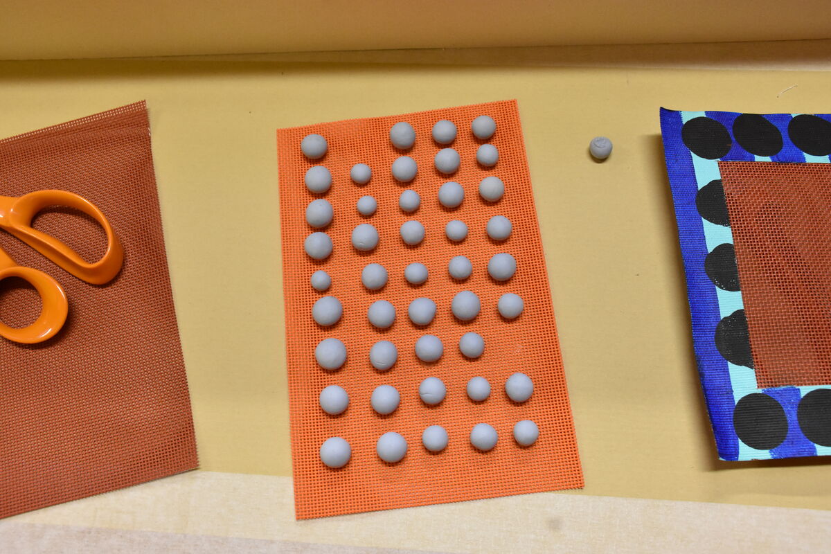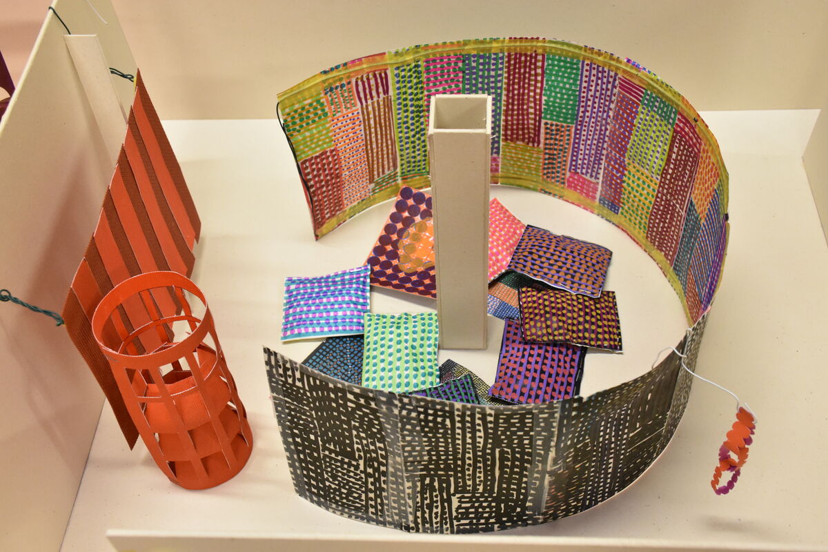 Je consacre également une partie de cette résidence à la conception d’une œuvre à jouer pour l’espace du P’tit BO. Je profite d’être sur place pour dessiner, valider les dimensions et proportions. Je réalise des échantillons et définis la règle du jeu et sa gamme de couleurs. Un dispositif d’initiation à l’espace, au plein et au vide, au motif et à la composition pour les grands et les petits !