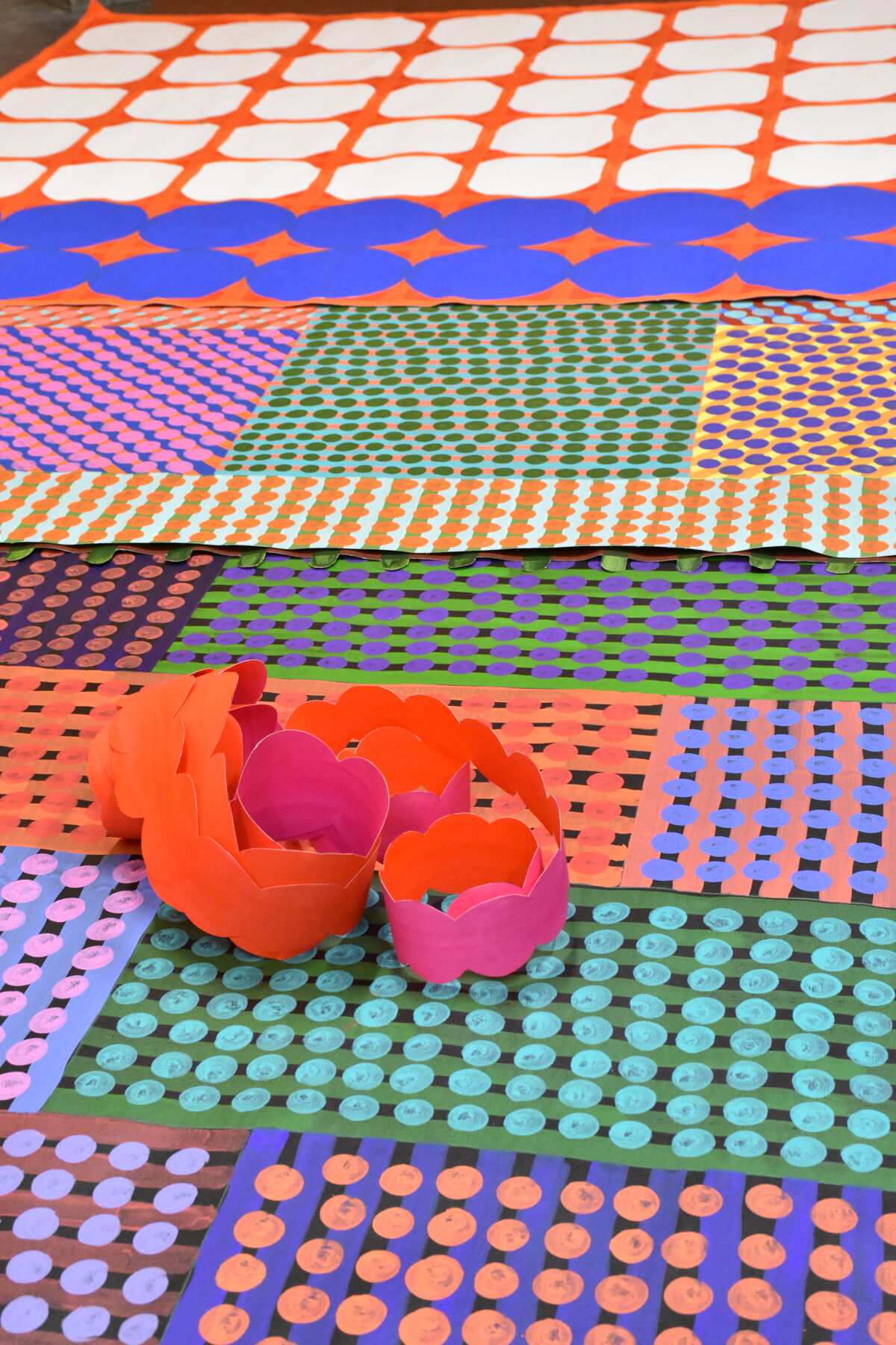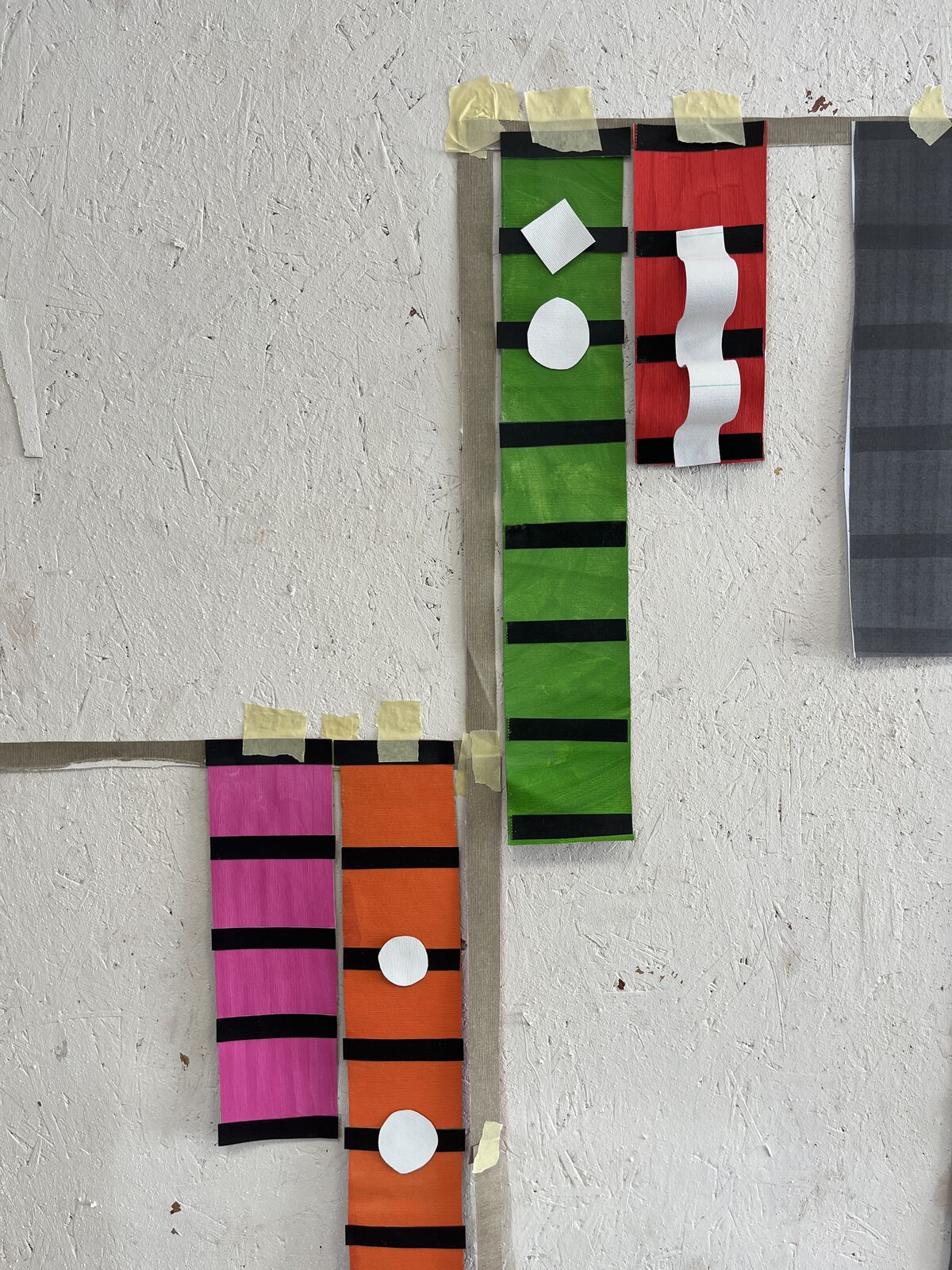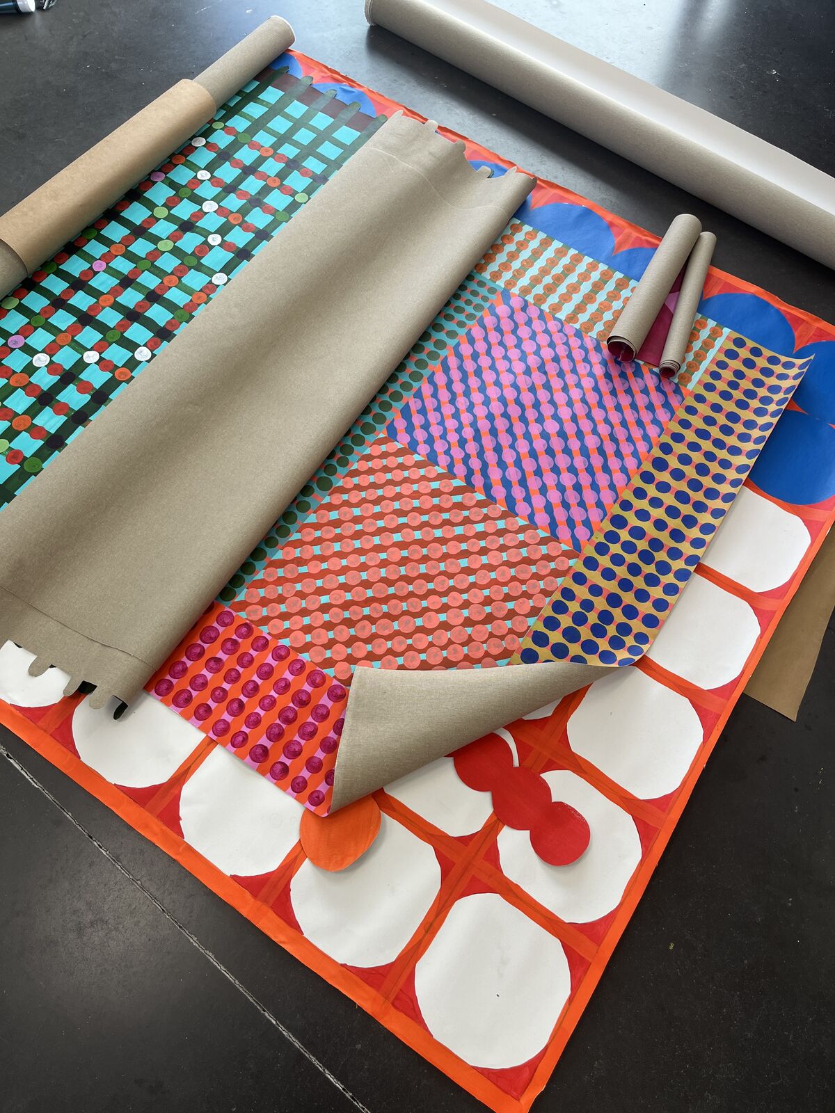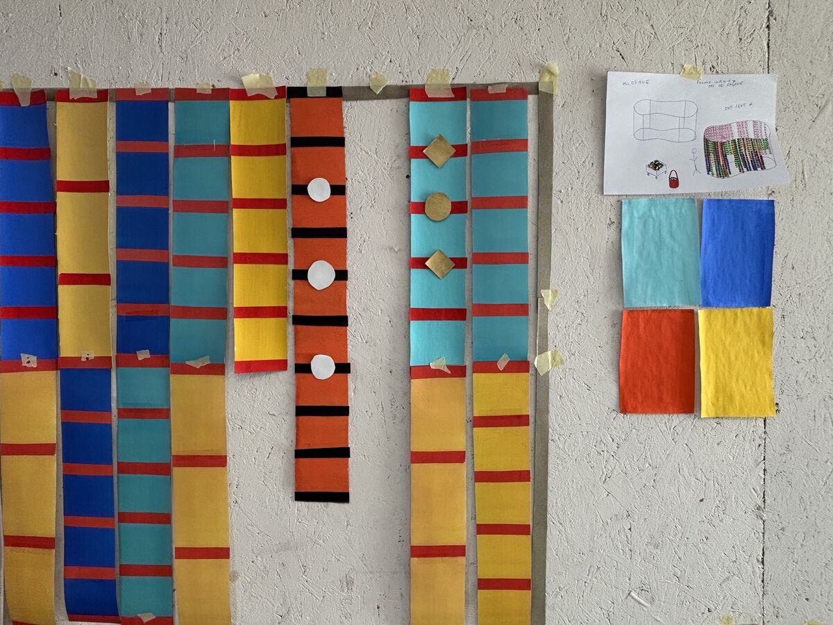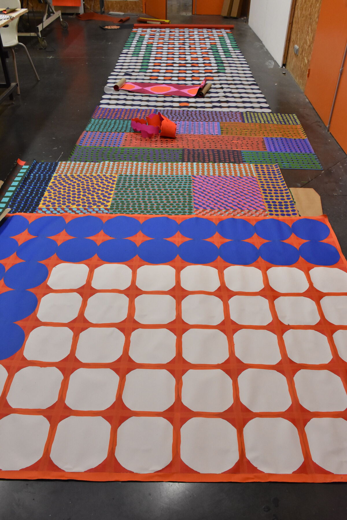 Pendant cette résidence, je me concentre sur les différents éléments textiles de l’exposition qui ouvrira dans un an, en février 2027. Je rencontre une couturière qui assemblera les différents pans de toile. Une fois le montage réalisé, je commencerai la peinture recto verso sur cette grande toile de 14m de long et presque 3m de haut. Je précise également la forme de coussins qui accompagneront cette grande installation et permettront aux spectateurs de prendre place et prendre le temps d’une immersion haute en couleurs.