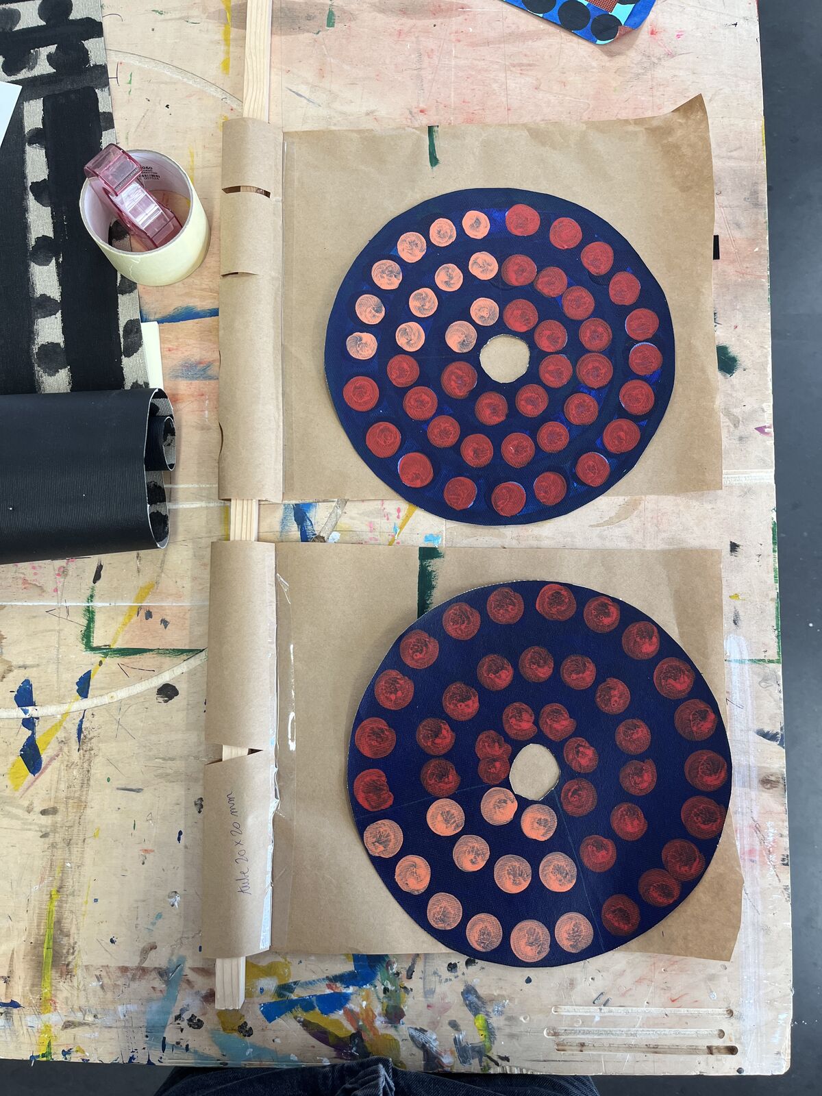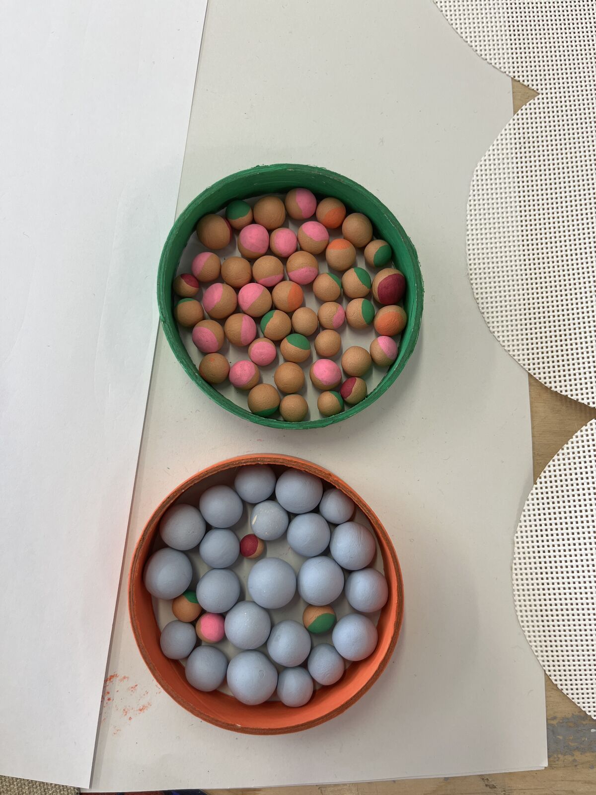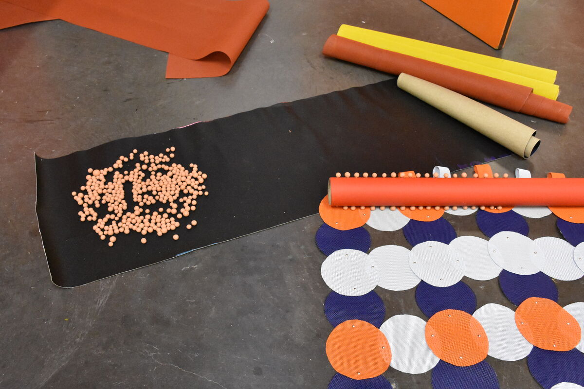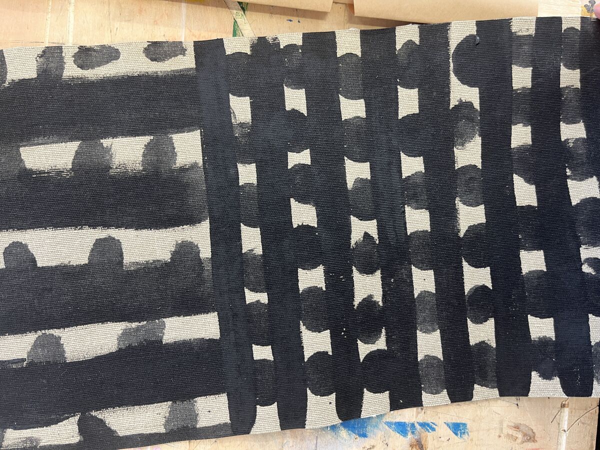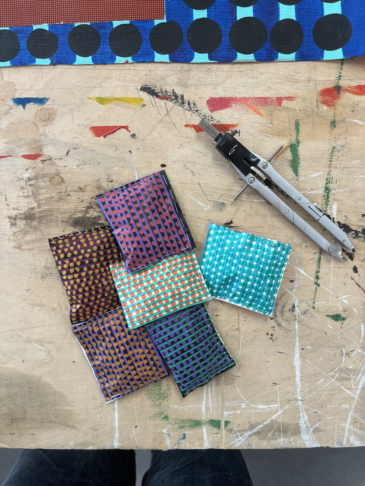 Pendant cette résidence, je me concentre sur les différents éléments textiles de l’exposition qui ouvrira dans un an, en février 2027. Je rencontre une couturière qui assemblera les différents pans de toile. Une fois le montage réalisé, je commencerai la peinture recto verso sur cette grande toile de 14m de long et presque 3m de haut. Je précise également la forme de coussins qui accompagneront cette grande installation et permettront aux spectateurs de prendre place et prendre le temps d’une immersion haute en couleurs.