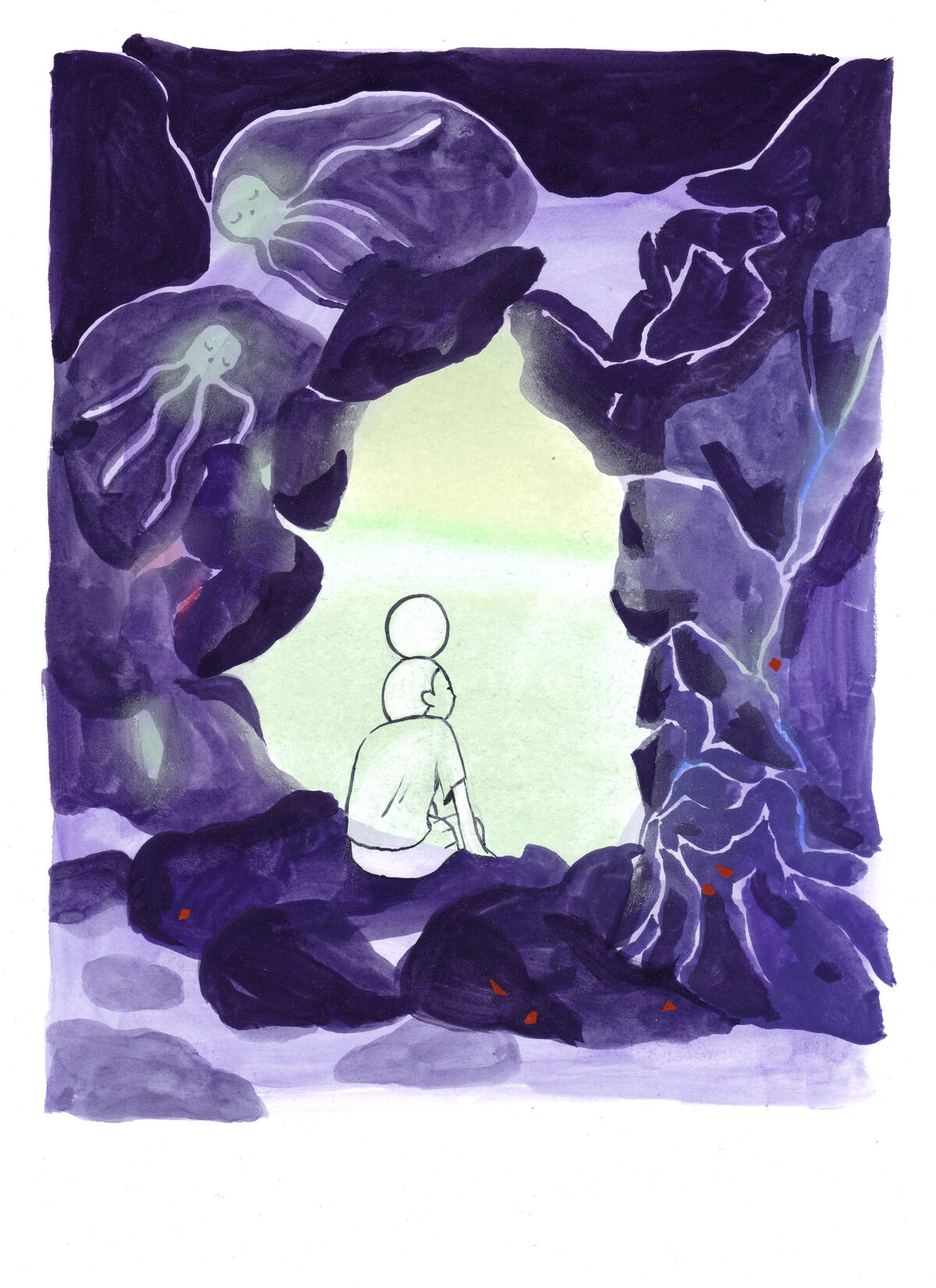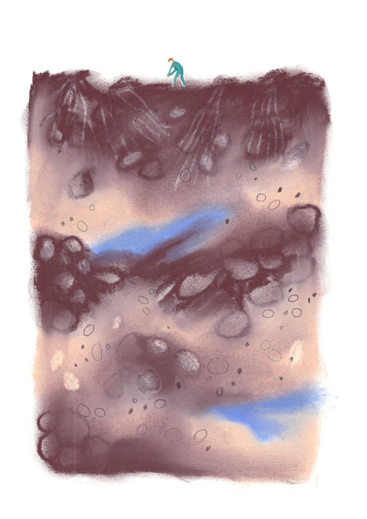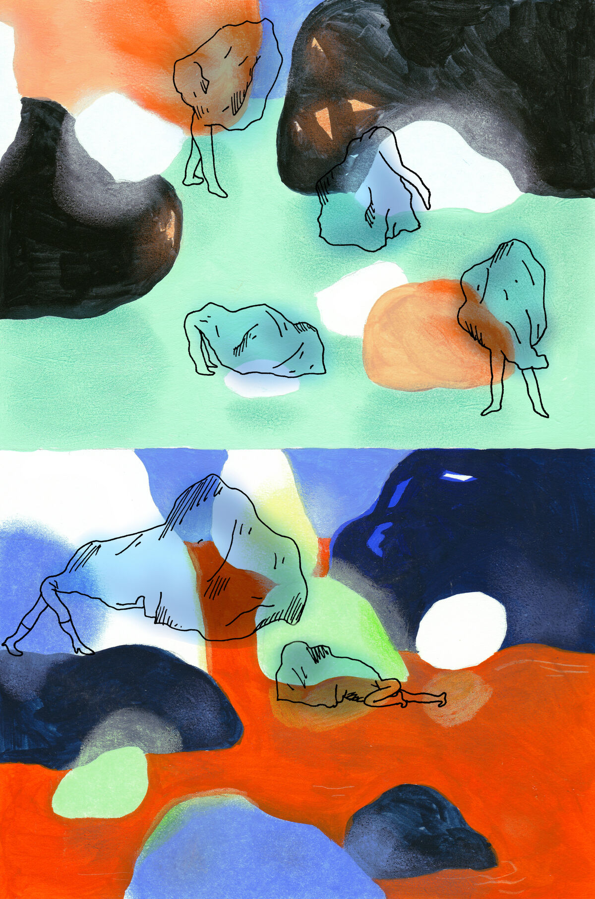 Pendant mon séjour de recherche au Bel Ordinaire, je souhaite explorer les paysages et espaces fictifs qui nous traversent et tenter de sonder des lieux imaginés. Je me questionne sur la façon dont les espaces rêvés font partie de nos réalités et peuvent refléter nos états, notre enracinement, nos déracinements, nos errances et aspirations. Ce projet vient notamment d’une volonté de donner au rêve une place centrale, qui se trouve très souvent menacée et me semble indispensable à l’épreuve du réel. Cette recherche est une façon de résister à tout ce qui entrave ou empêche l’état de songe, de contemplation, et d’inviter le regard à plonger. Un sol qui souffle, des pieds enracinés dans la roche, une tête en fontaine ou en saule, un dos végétal, mes images tendent à associer le corps à son environnement et à envisager le paysage comme un corps. J’aimerais approfondir cette relation corps-espace, aussi bien dans les images réalisées que dans ma propre expérience de la pratique du dessin.