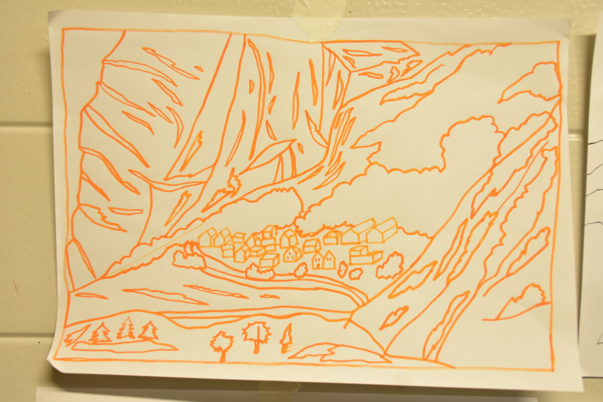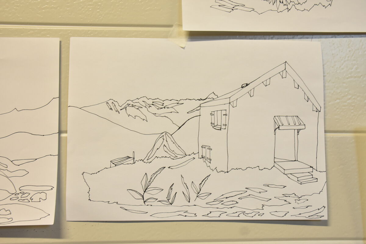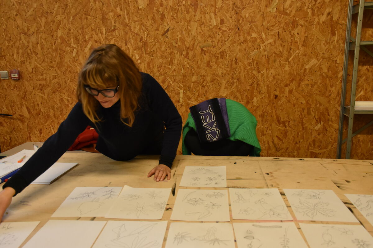 En parallèle, je travaille sur la composition d’un nouveau dessin grand format qui prendra la forme d’un grand rideau, reprenant un paysage de montagne assez détaillé, avec des bordures fleuries et une palette de couleurs complexe. La grandeur des espaces du BO me permettront facilement d’avancer sur cette grande composition textile.