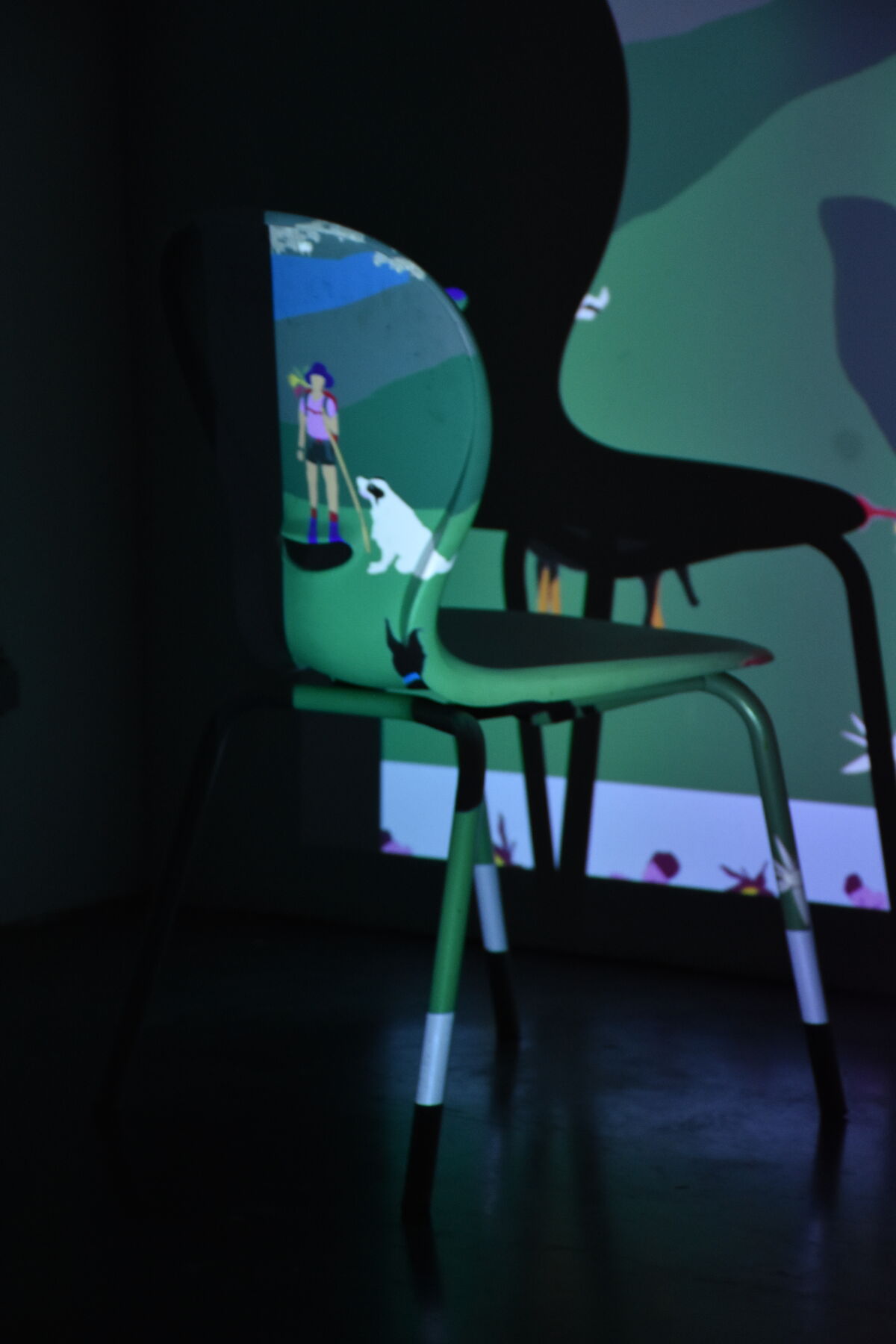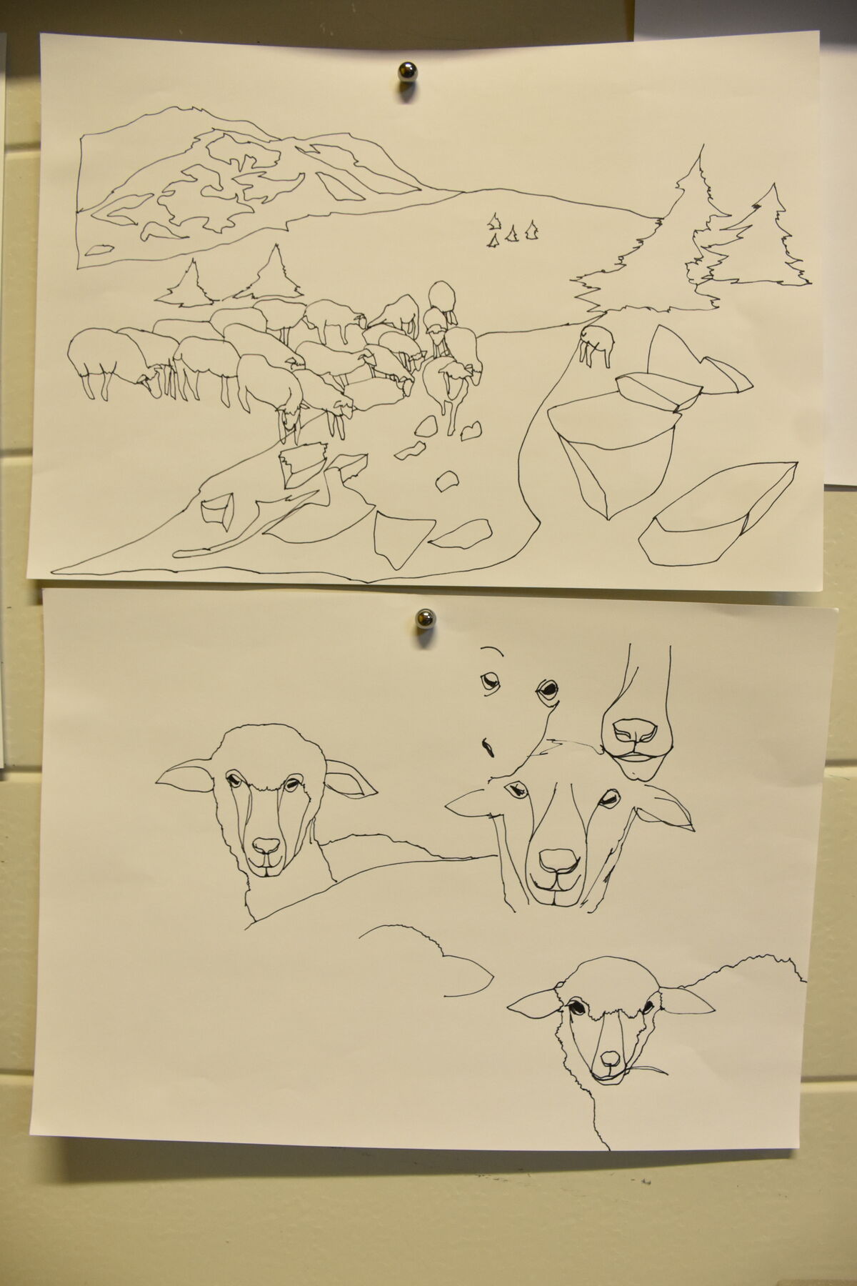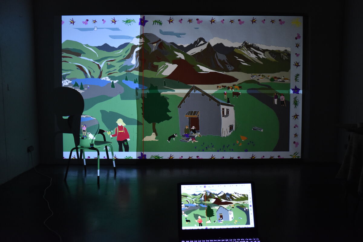 J’ai d’abord passé quelques jours à dessiner, d’après des photographies prises lors de mes gardes l’été dernier en Savoie : des animaux, des paysages, des fleurs, des personnages, des nuages. Après un travail de composition numérique pour recréer un paysage d’estive en jouant avec les éléments, les proportions, la bordure, j’ai reporté le dessin final à échelle 1 sur un grand papier. La composition numérique est une étape importante puisqu’elle constitue la maquette pour la réalisation de la tenture. Chaque élément reporté sur le papier me servira pour réaliser des patrons que je reporterai sur les tissus attribués afin de les découper puis les coudre. Cette tenture s’inscrit dans la suite de la série des chiens, dans une volonté de créer un paysage d’estive plus immersif pour les spectateurs et les spectatrices.