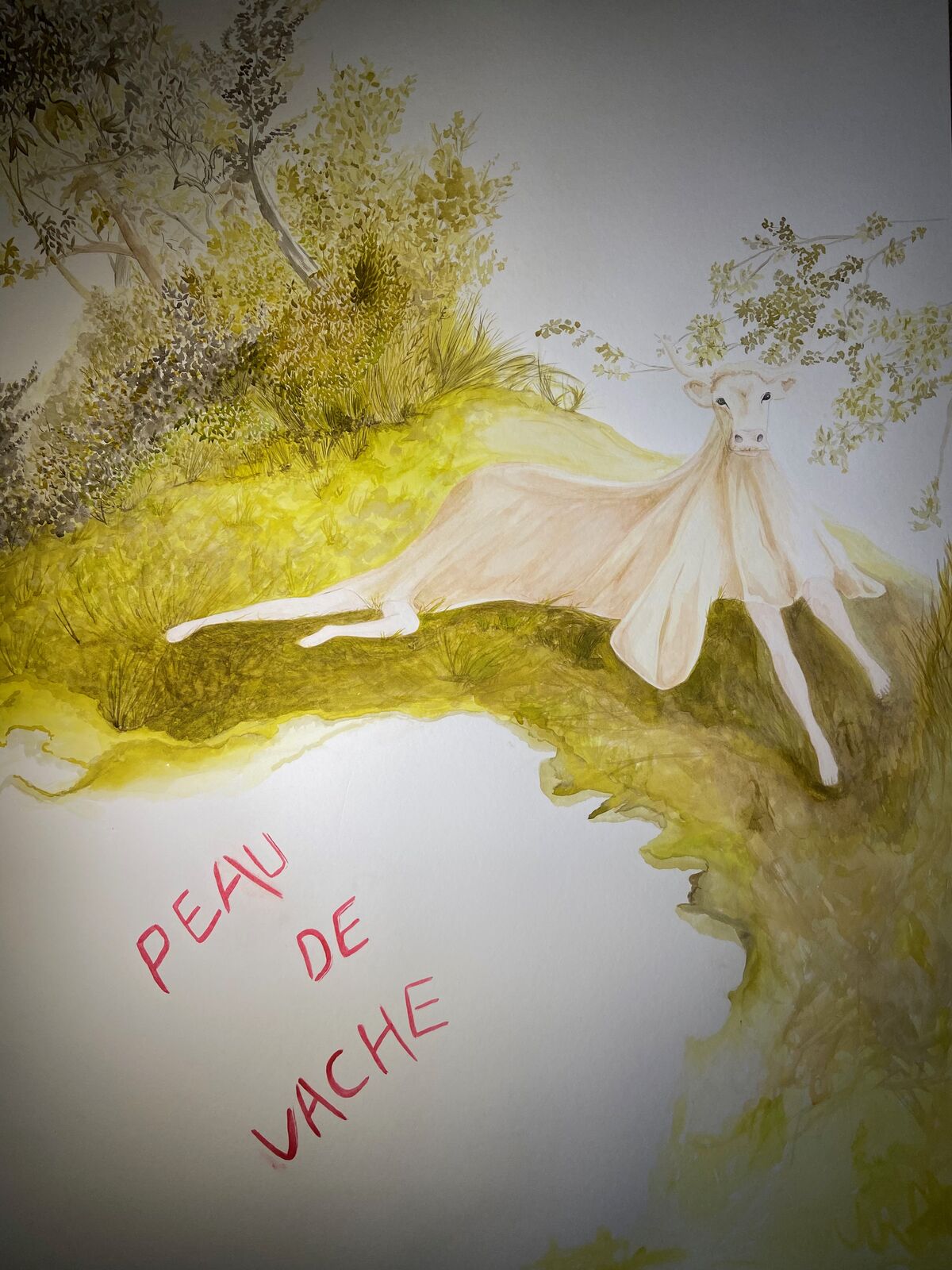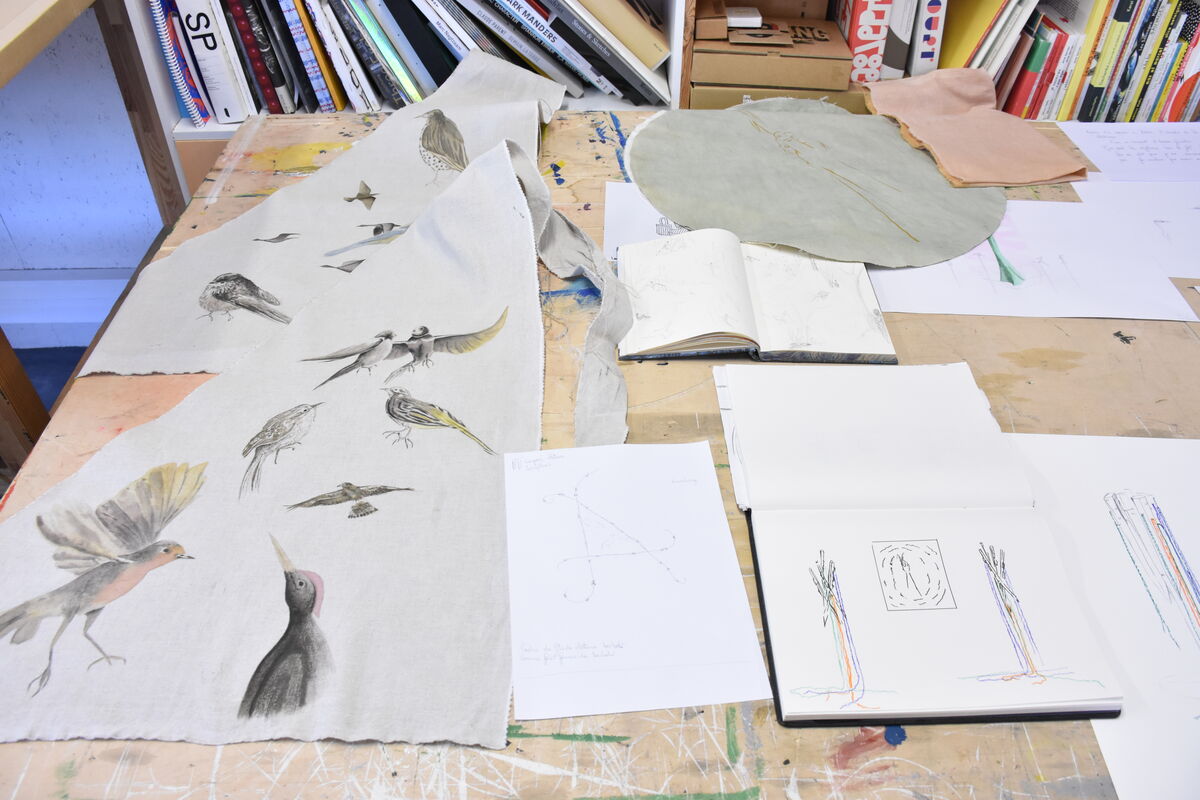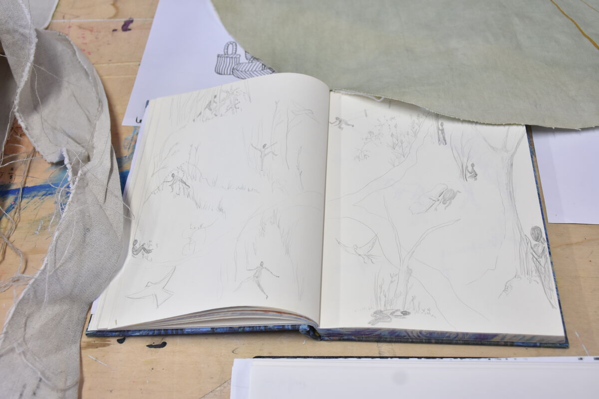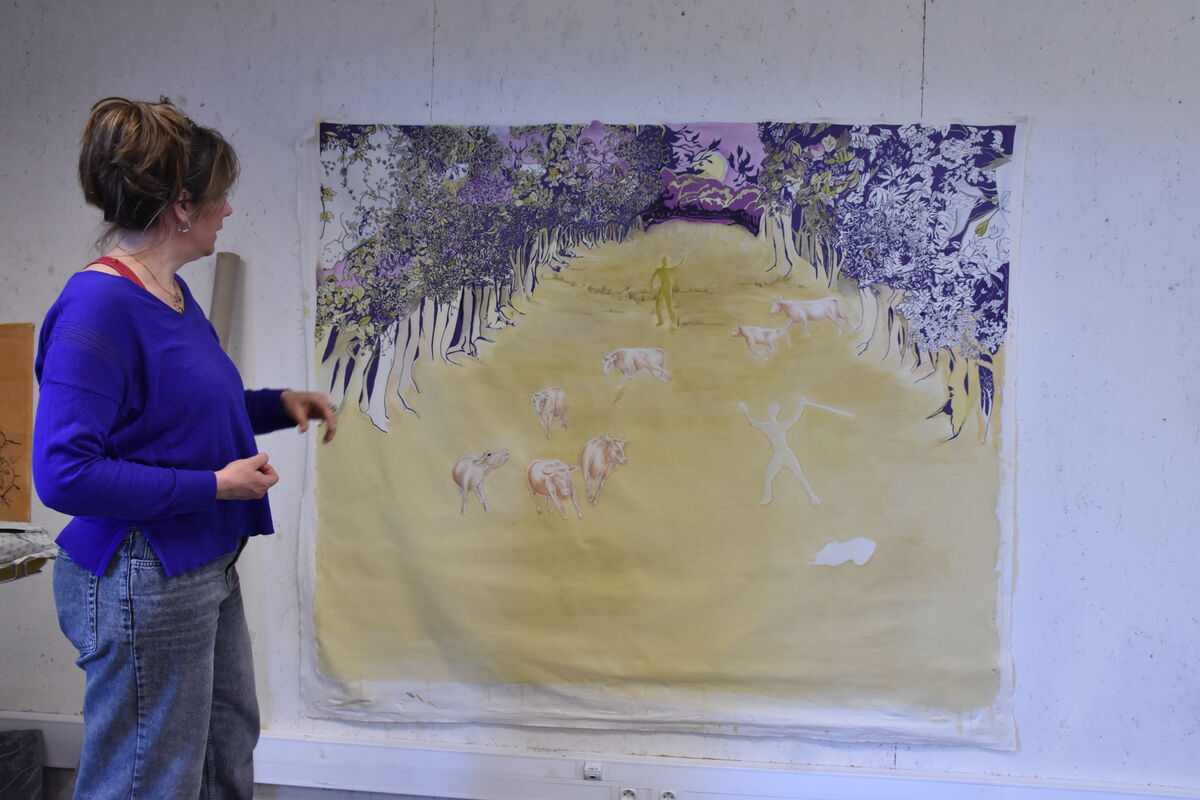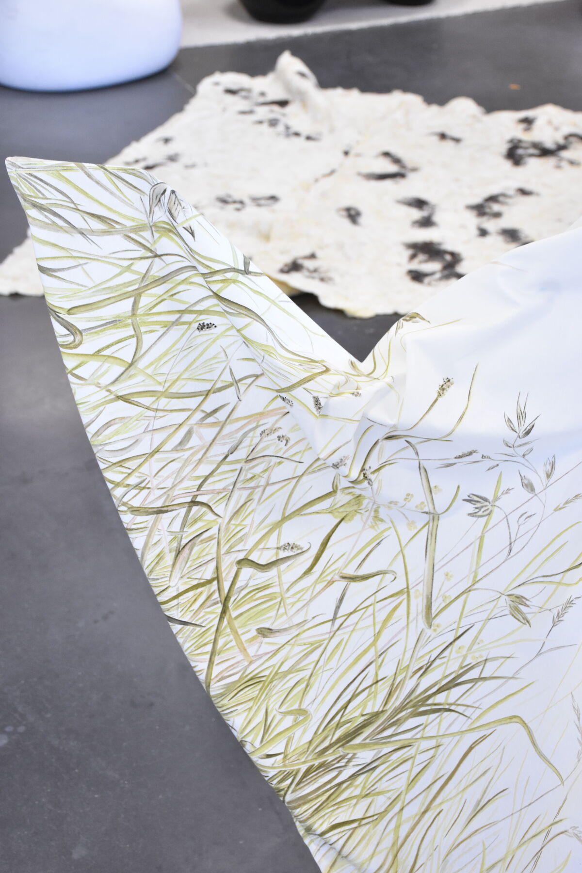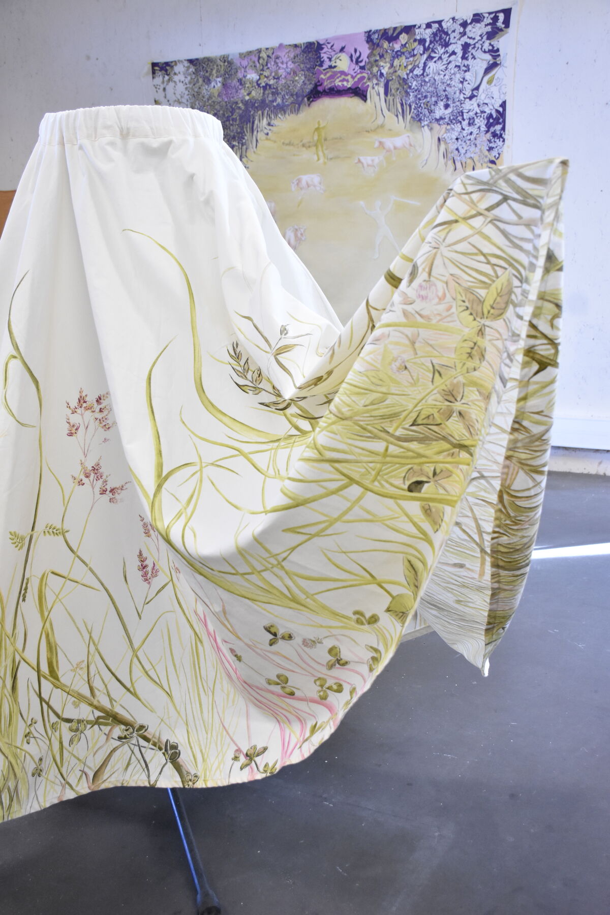 Depuis sa venue en 2025, elle a finalisé plusieurs pièces amorcées en résidence de production. Des peintures ou sérigraphies textiles ont été réalisées avec des encres végétales, la prairie et la forêt se donnent à voir au travers des représentations que l’artiste nous propose mais aussi au travers des couleurs, avec les pouvoirs picturaux des végétaux. Un costume est pensé pour l’installation, une jupe ornée d’une prairie. Une jupe longue, dont le patron est un cercle, qui invite à l’activation de l’installation, dans une danse avec un mouvement de toupie, comme la rotation de la terre et la répétition des saisons. Avec cette pièce centrale de son travail, l’intention de Marie Labat est de trouver une proposition d’installation permettant sa lecture comme objet artistique et permettant un dispositif performatif. D’autres matériaux sont utilisés dans la production de l’artiste, la gravure sur pierre d’Arudy, la vannerie sauvage mais aussi la laine et le feutrage avec un travail de peau de vache dans les ateliers de l’association TRAME à Oloron-Sainte-Marie.