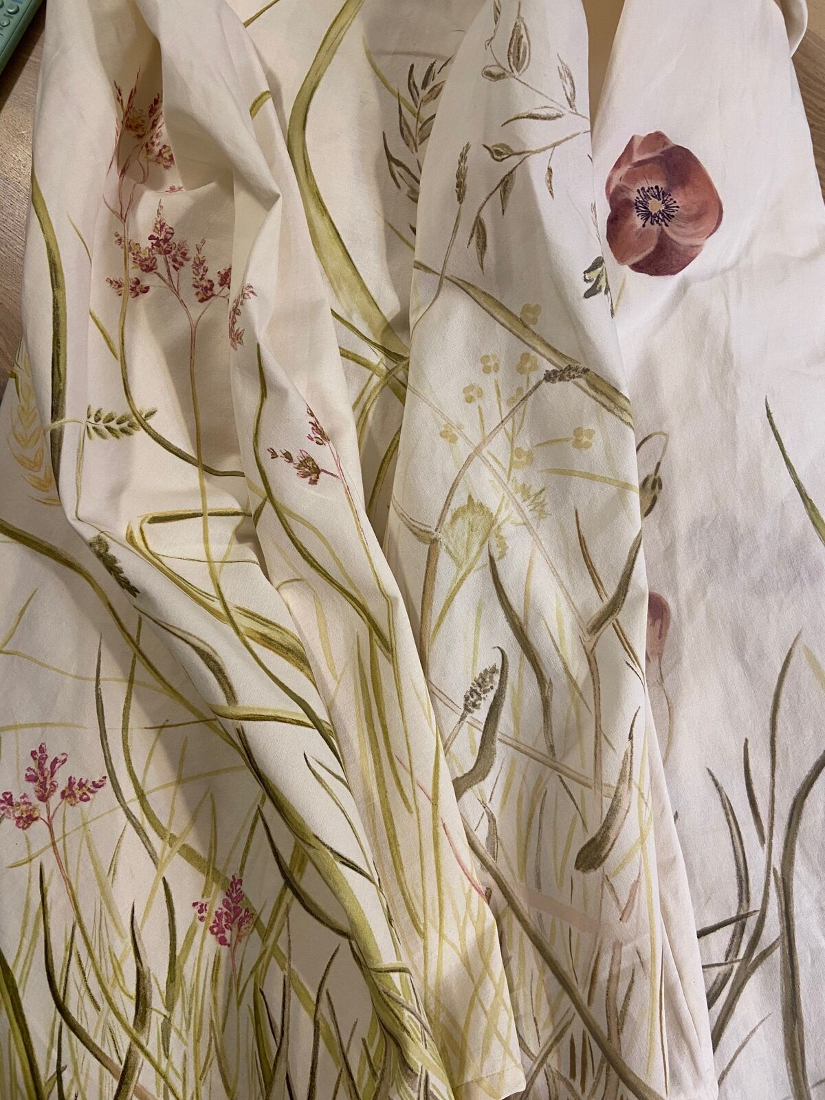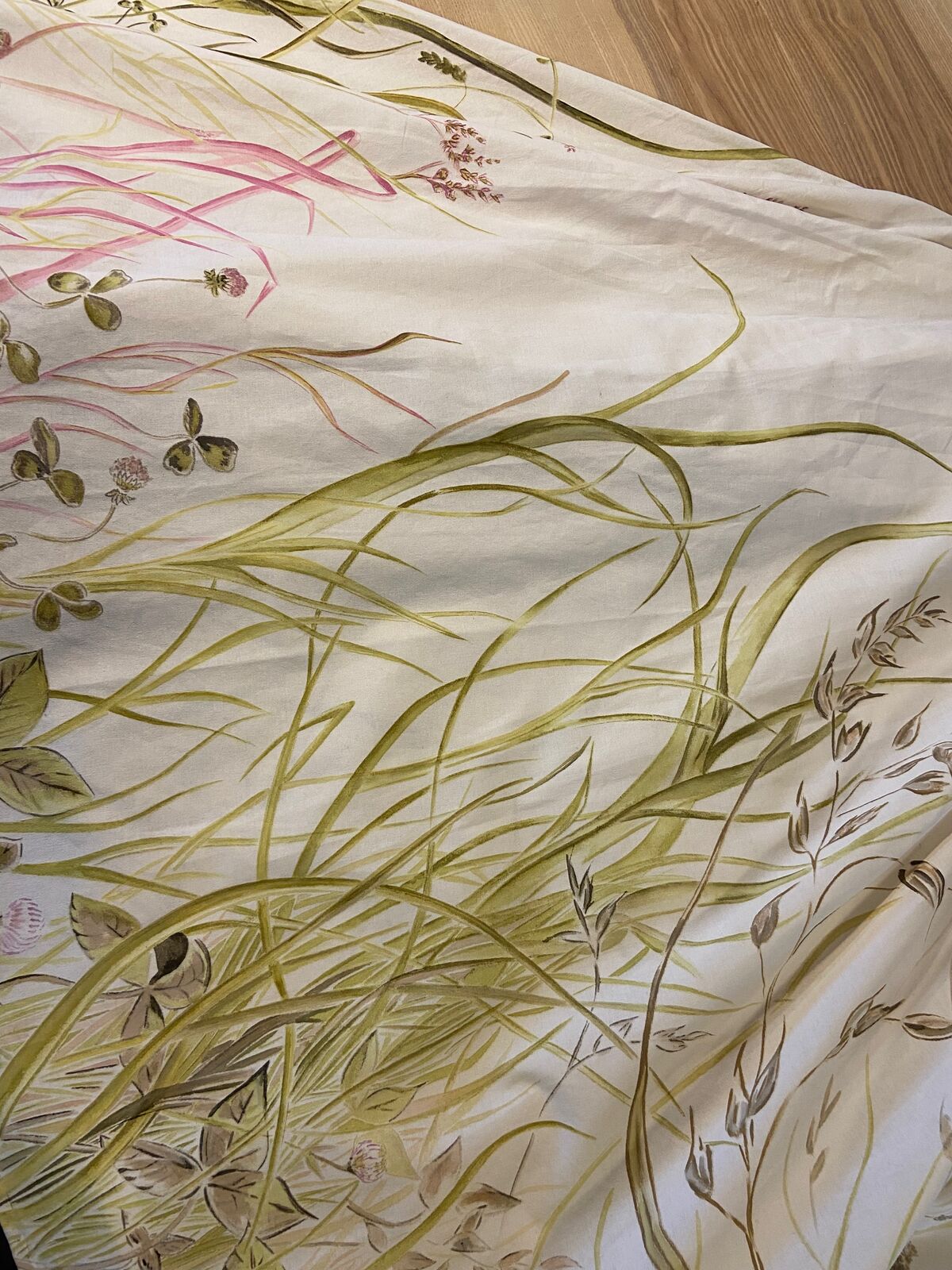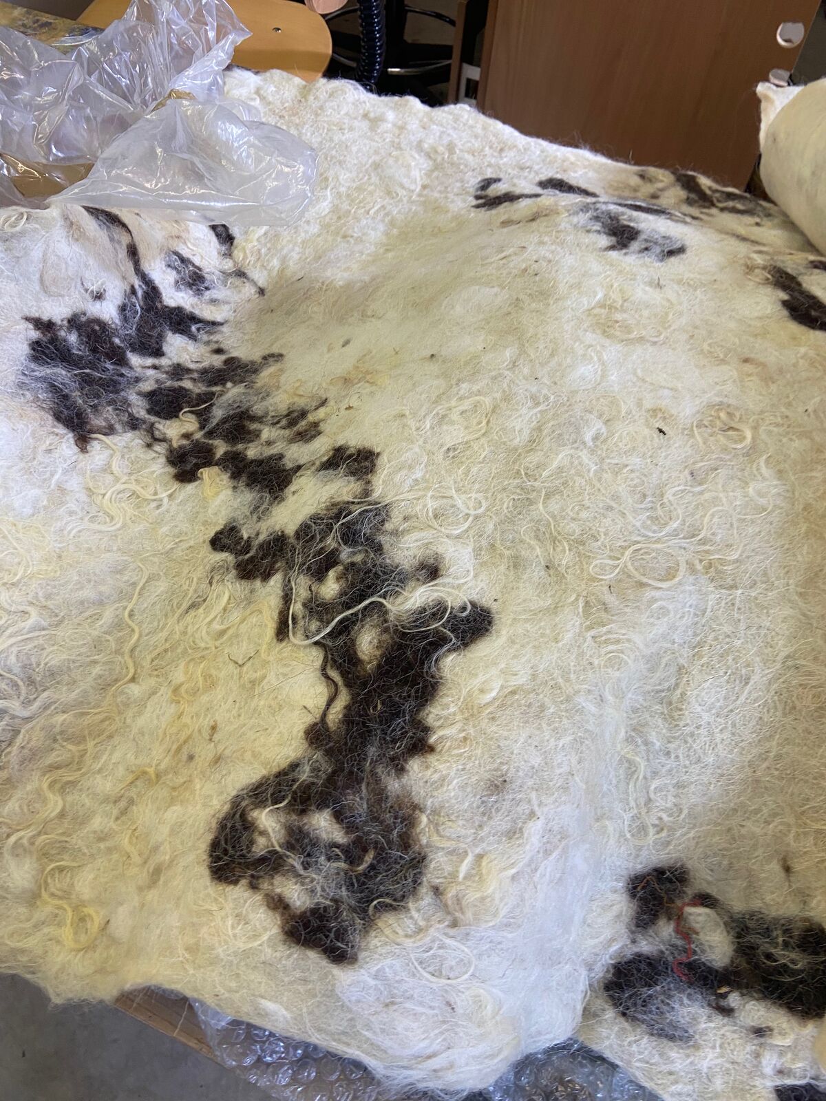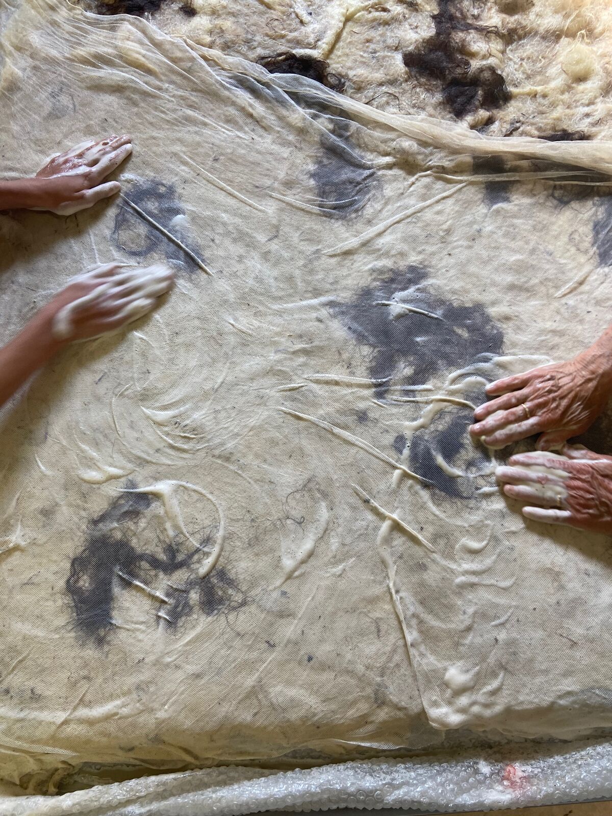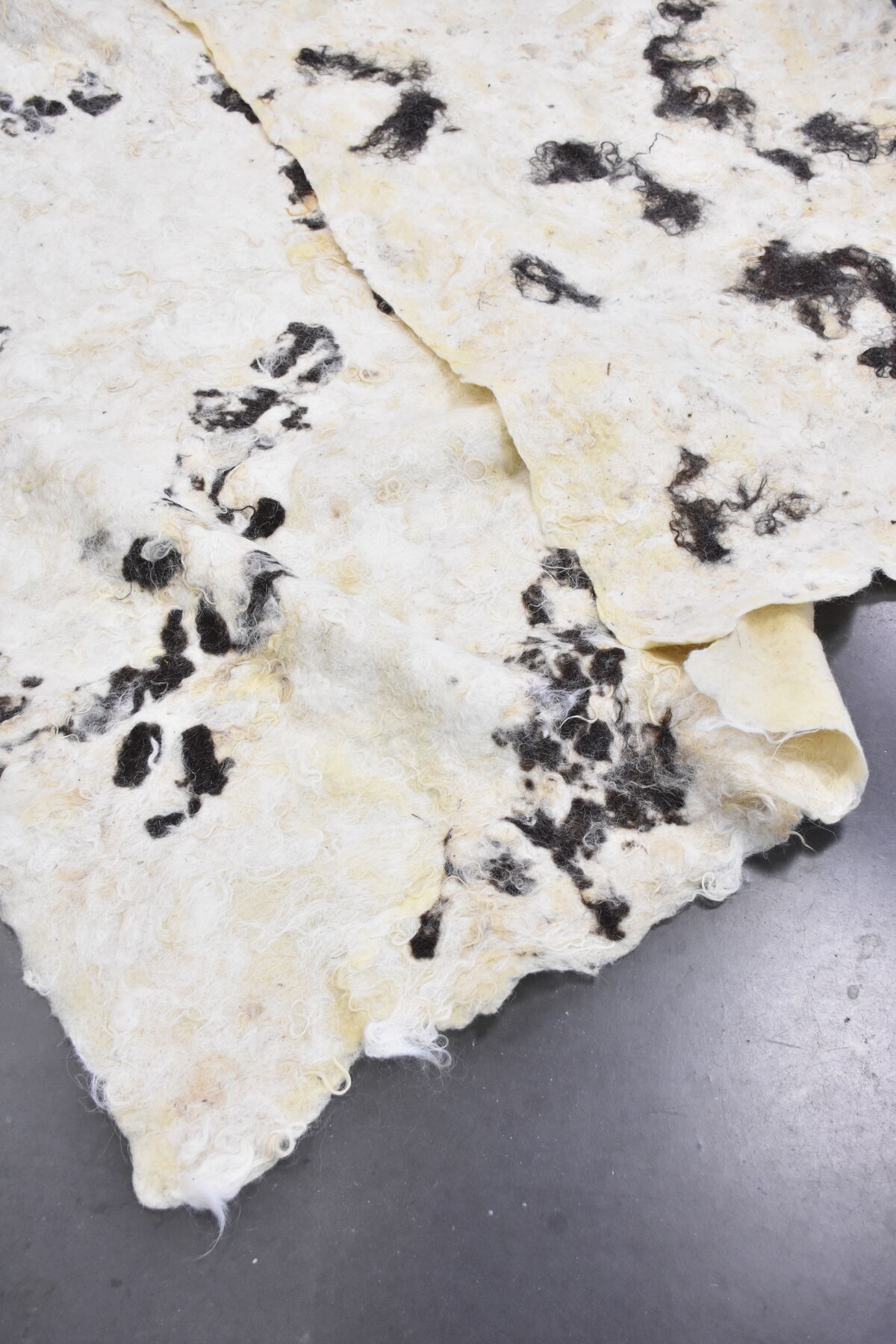 Depuis sa venue en 2025, elle a finalisé plusieurs pièces amorcées en résidence de production. Des peintures ou sérigraphies textiles ont été réalisées avec des encres végétales, la prairie et la forêt se donnent à voir au travers des représentations que l’artiste nous propose mais aussi au travers des couleurs, avec les pouvoirs picturaux des végétaux. Un costume est pensé pour l’installation, une jupe ornée d’une prairie. Une jupe longue, dont le patron est un cercle, qui invite à l’activation de l’installation, dans une danse avec un mouvement de toupie, comme la rotation de la terre et la répétition des saisons. Avec cette pièce centrale de son travail, l’intention de Marie Labat est de trouver une proposition d’installation permettant sa lecture comme objet artistique et permettant un dispositif performatif. D’autres matériaux sont utilisés dans la production de l’artiste, la gravure sur pierre d’Arudy, la vannerie sauvage mais aussi la laine et le feutrage avec un travail de peau de vache dans les ateliers de l’association TRAME à Oloron-Sainte-Marie.