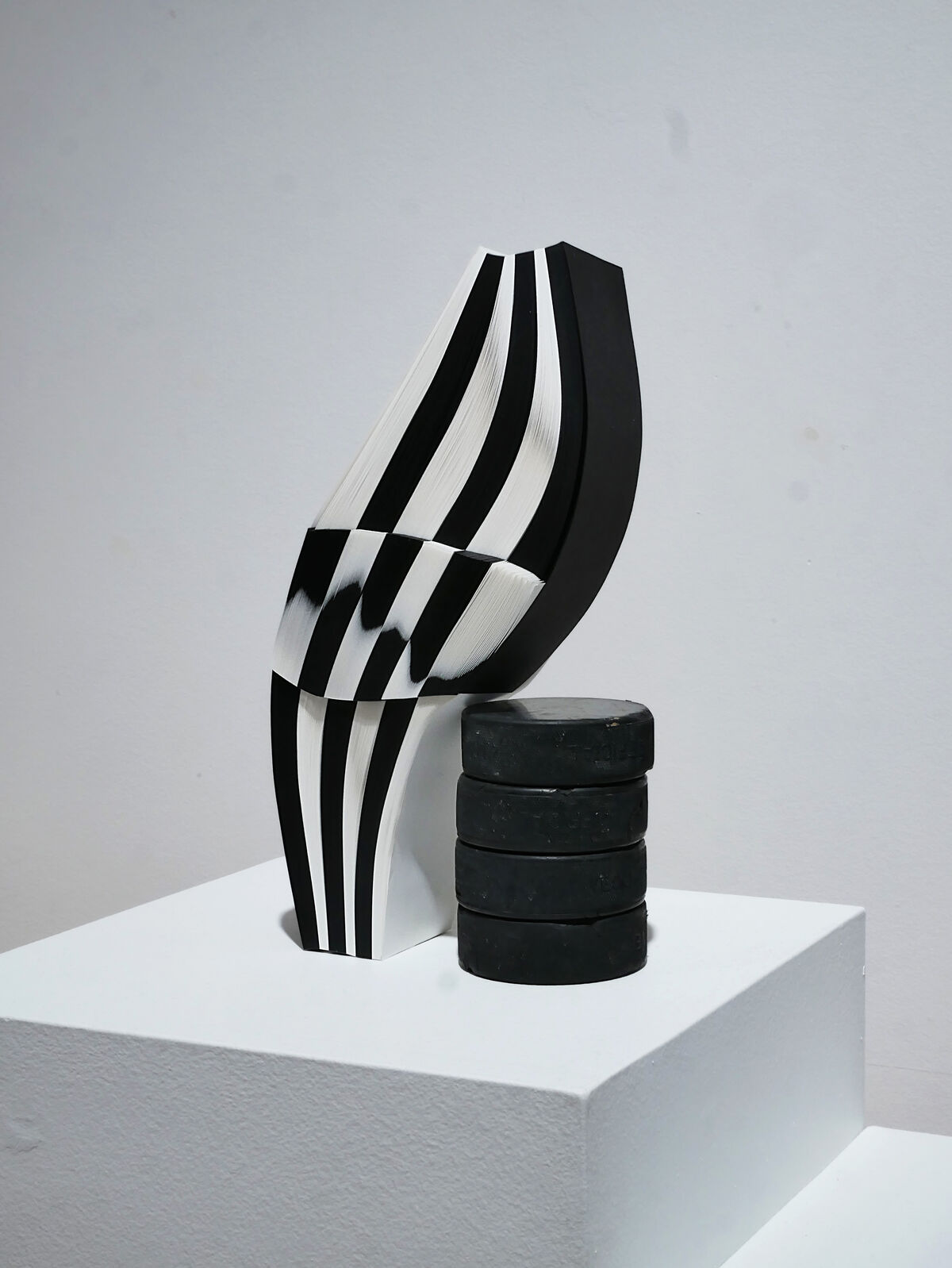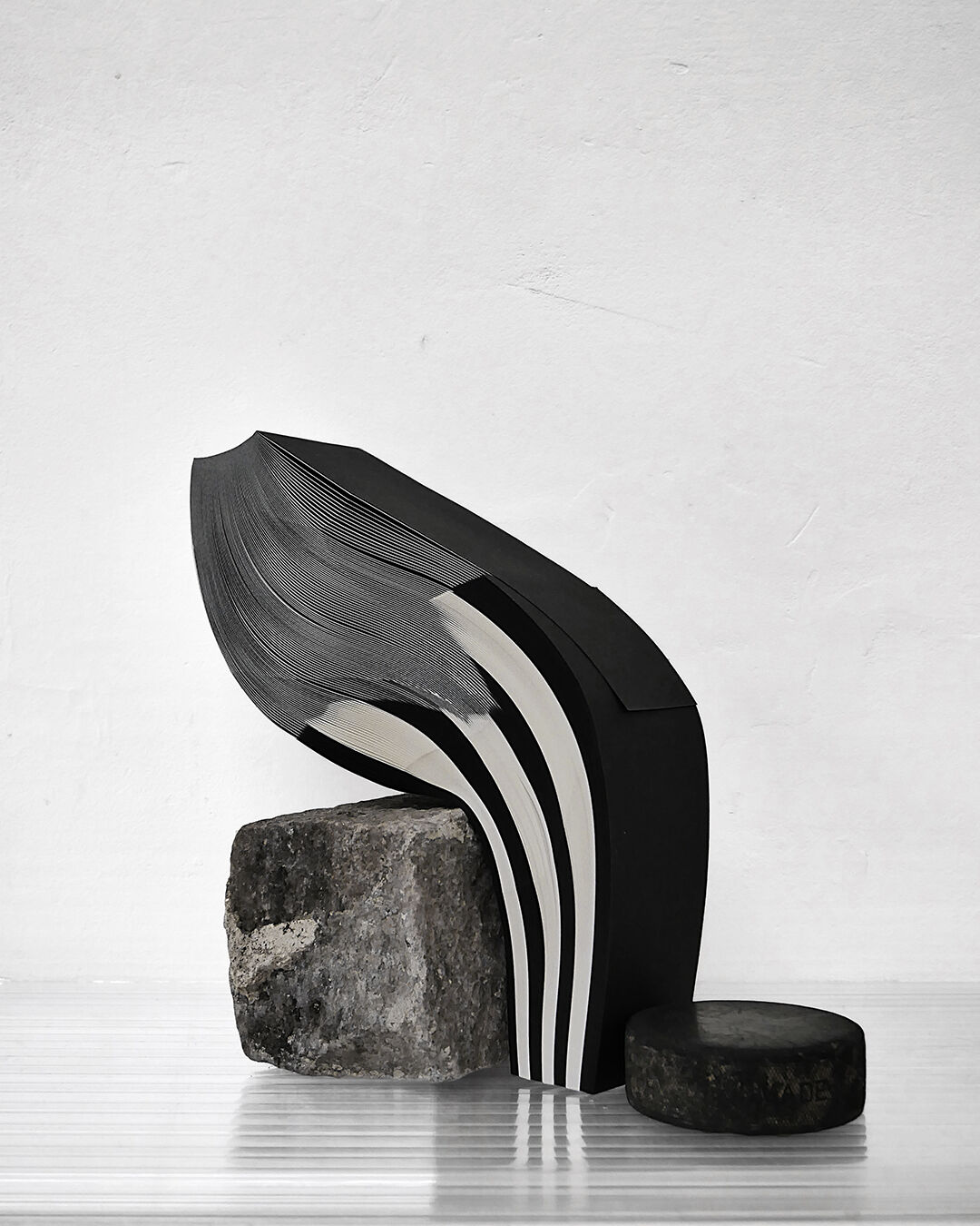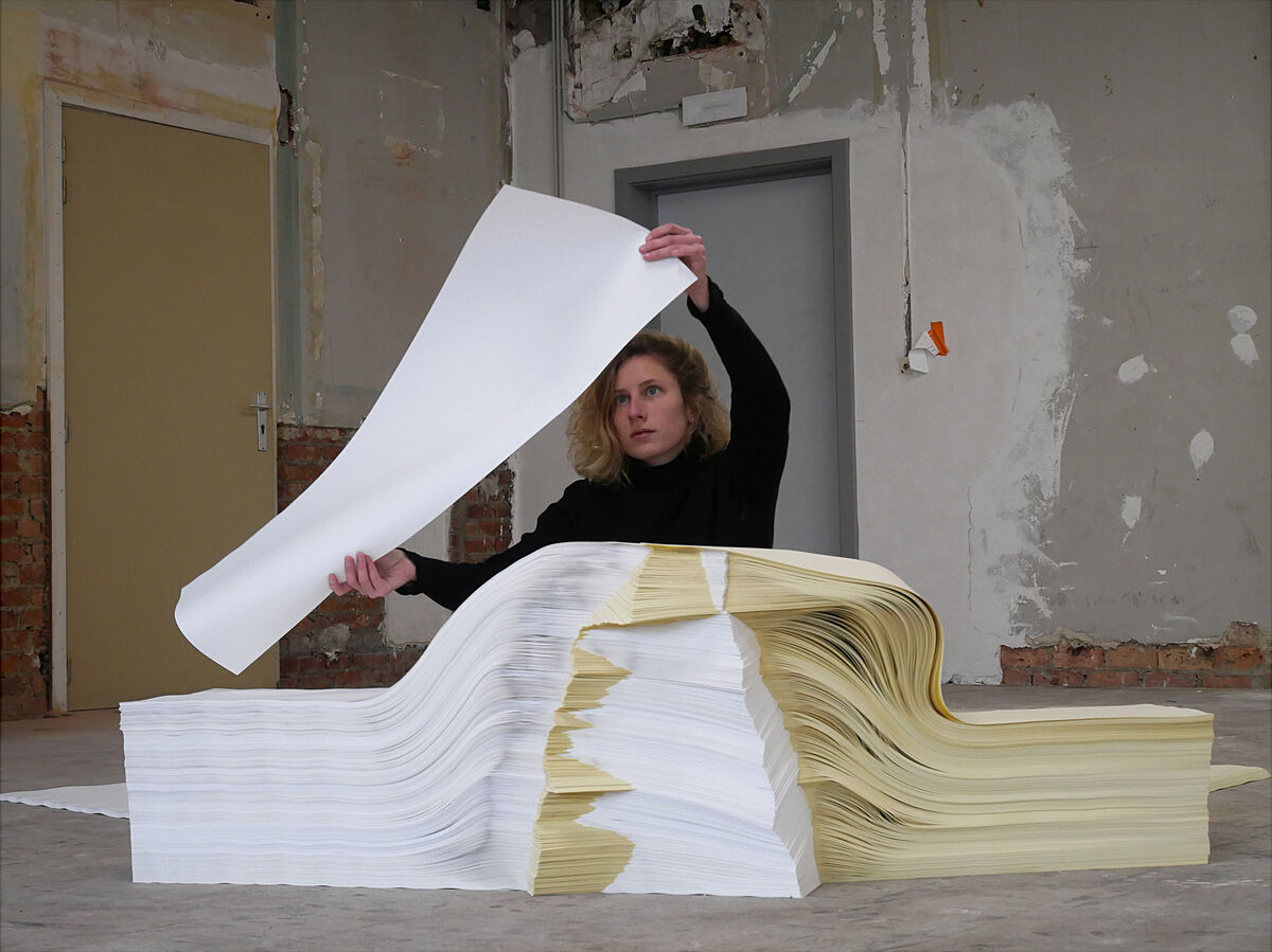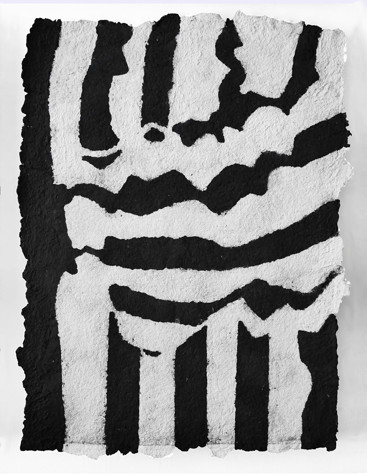 Les lignes noires et blanches se sont liées et déliées par l’encre et le dessin ; ondulées et floutées par la pulpe de papier. Par un geste répété, elles se sont multipliées et abstraites, puis déplacées dans le champ de l’ordinaire. Elles sont alors devenues surface de réflexion : à quel moment sommes nous légitimes d’arbitrer une situation ? Pourrions nous porter un maillot rayé pour asseoir notre position de témoin et non plus de spectateur·ice ? Ces lignes témoigneraient elles de notre volonté d’agir ?