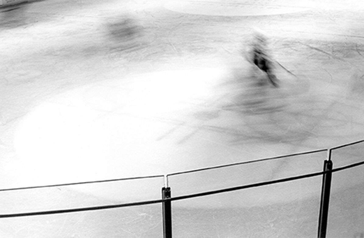 À la marge des rayures s’immisce dans les milieux sportifs et particulièrement le hockey-sur-glace. Après avoir filmé pendant six ans les entraînements, les matchs et le cœur des vestiaires d’une équipe de région parisienne, mon attention se porte à présent sur la figure de l’arbitre. Être à la marge est indispensable au bon déroulement de la rencontre, il·elle est vêtu·e d’un maillot rayé emblématique, patine, surveille, juge et actionne une chorégraphie de 26 gestes pour envoyer les joueur·euse·s quelques minutes en prison lors d’une pénalité. Les rayures s’activent, le corps prend position et le textile se fige en une superposition de lignes noires et blanches.