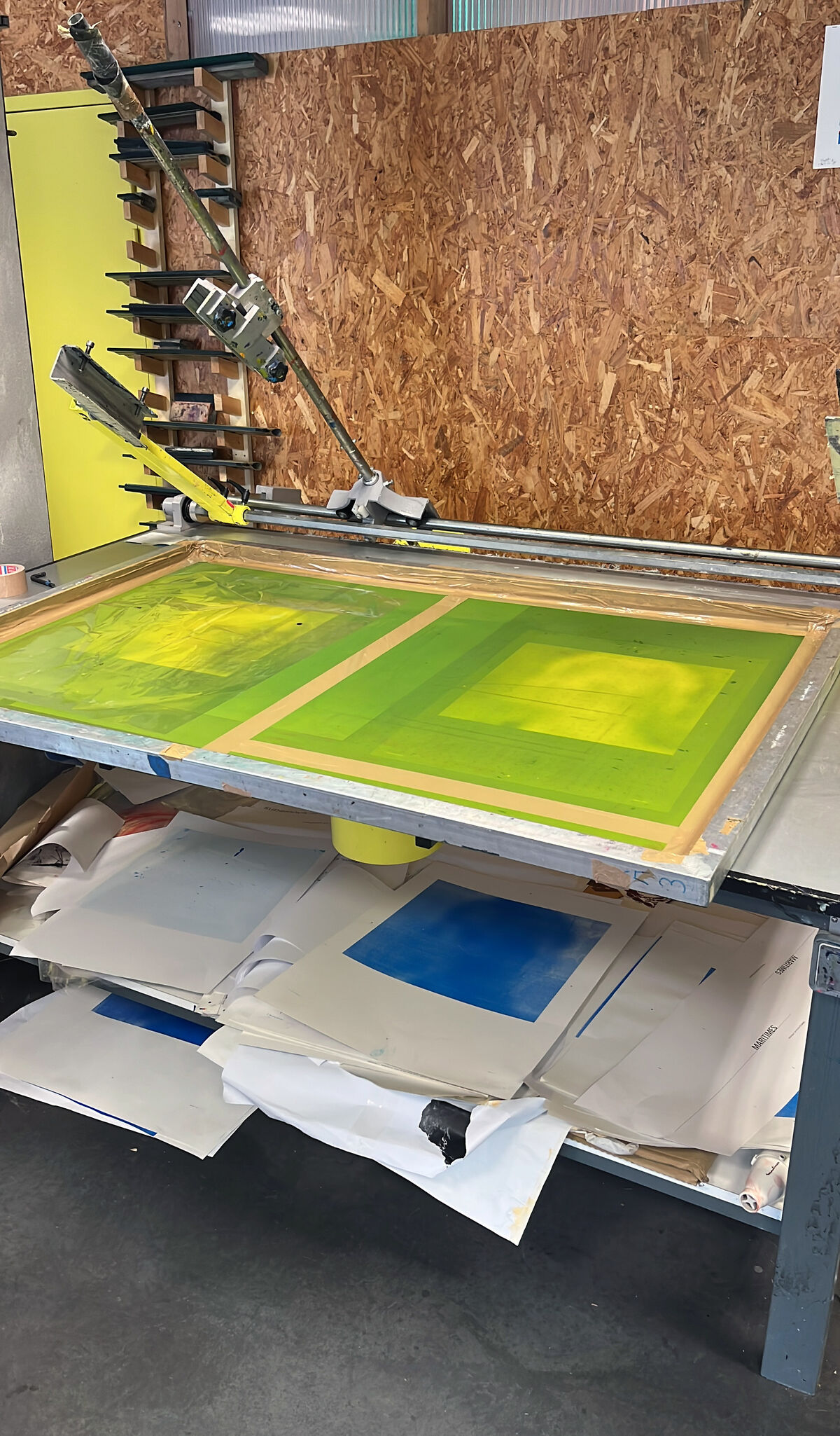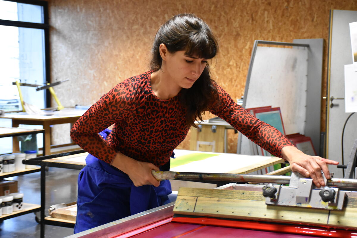 Dans cette poursuite de recherche au Bel Ordinaire, je continue la production matérielle de ces images capturées par mon téléphone. Le passage d’un écran (numérique) à l’autre (physique), demande des choix de trames, d’ordre de couches de couleurs pour traduire ces flous, qui ont été arrêtés dans la première partie de la recherche. Reste à poursuivre ce travail dans un plus grand format et dans le temps long de la sérigraphie manuelle, en appréciant les surprises qu’occasionne ce procédé lorsqu’on le travaille en quadrichromie. Observer la magie de la découverte progressive de l’image en devenir, couche de couleur après couche de couleur, jusqu’à son apparition complète. Un ressenti finalement assez proche de celui de l’attente d’apparition d’une image sur smartphone… mais plutôt que l’attente décevante, être dans la joie du « faire ».